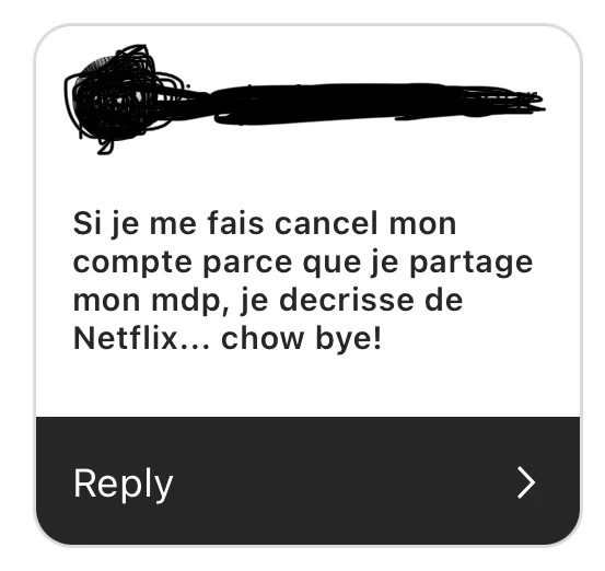 Et partager son compte Netflix, ça coûte maintenant 7,99 $ par usager de plus par mois. Ces personnes ont leur propre profil et même leur propre mot de passe, mais c’est la personne qui détient le compte qui paie toute la facture.