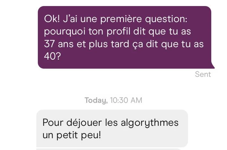 Son nom commence par D, il vit à Montréal, il a 37 ans. En lisant le contenu de son profil un peu plus en profondeur, une information retient mon attention: « Mon profil dit que j’ai 37 ans, mais en fait, j’ai 40 ans. ».