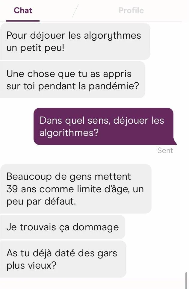 «Ark!, s’exclame-t-elle, sans trop de nuances. Personnellement, je trouve ça très manipulateur. Si je paramètre mon app pour voir des gens entre 25 et 35 ans, ce n’est pas pour que des dudes de 40 ans se mettent à «déjouer l’algorithme», voyons donc. En fait ce qui me dérange, c’est que je n’y vois qu’une seule motivation: se pogner des filles plus jeunes».