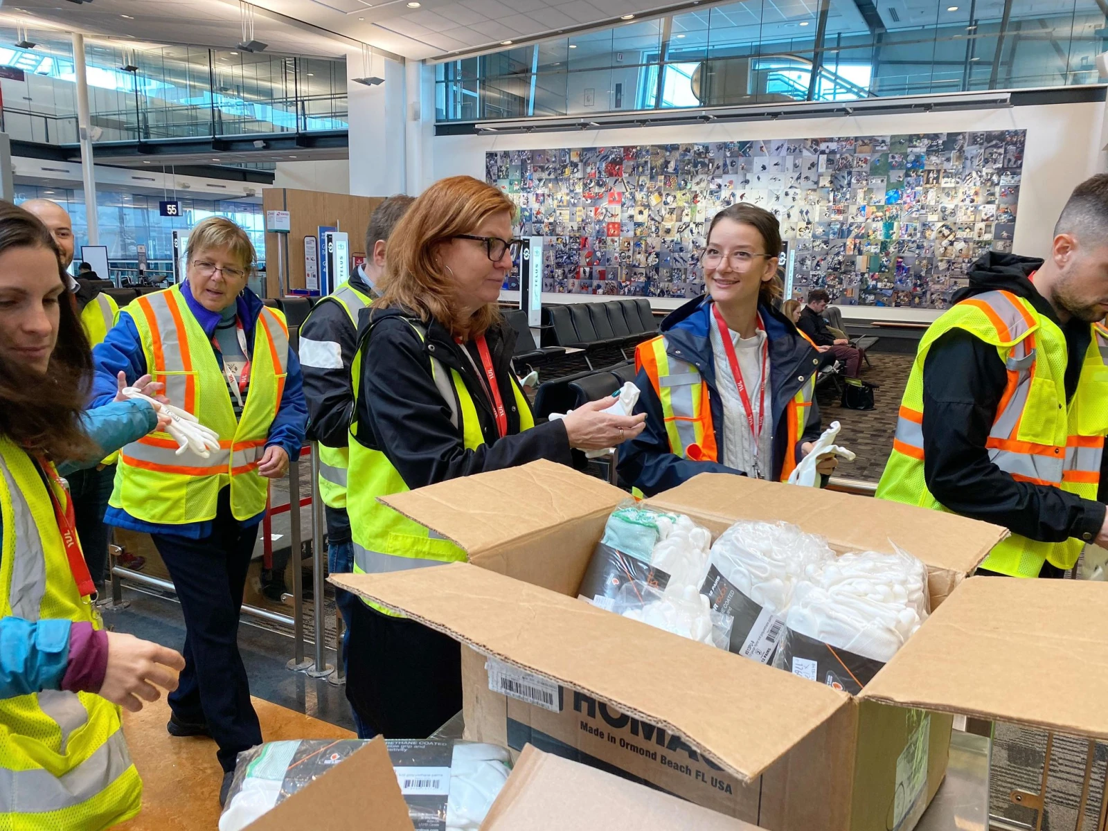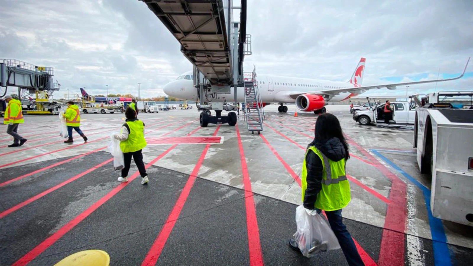 Les volontaires sont ensuite scindé.e.s en trois groupes pour se partager la tâche. Une équipe ira nettoyer le tarmac du côté des vols américains, une autre les vols domestiques, et enfin, un dernier contingent sillonnera la section internationale.