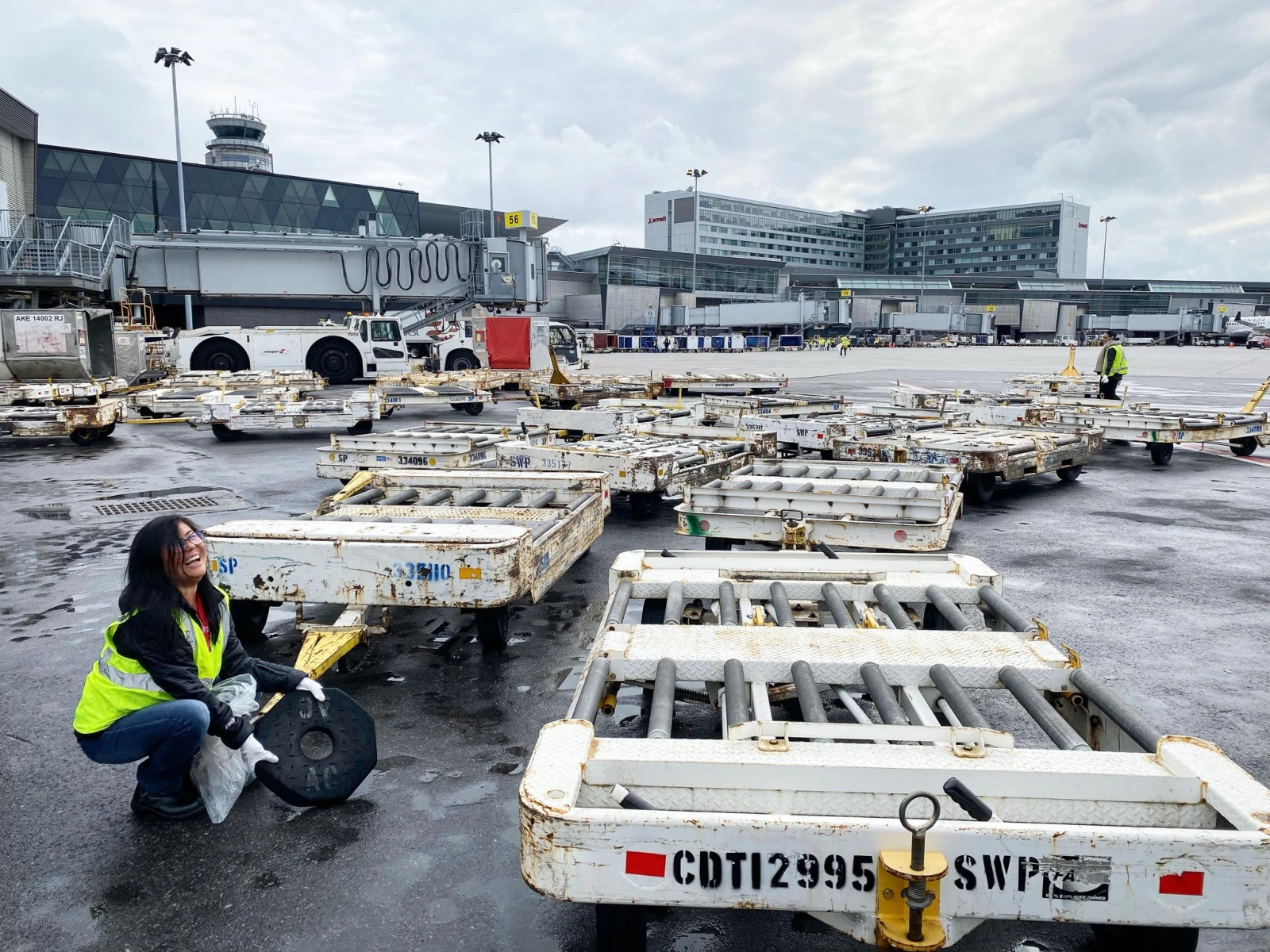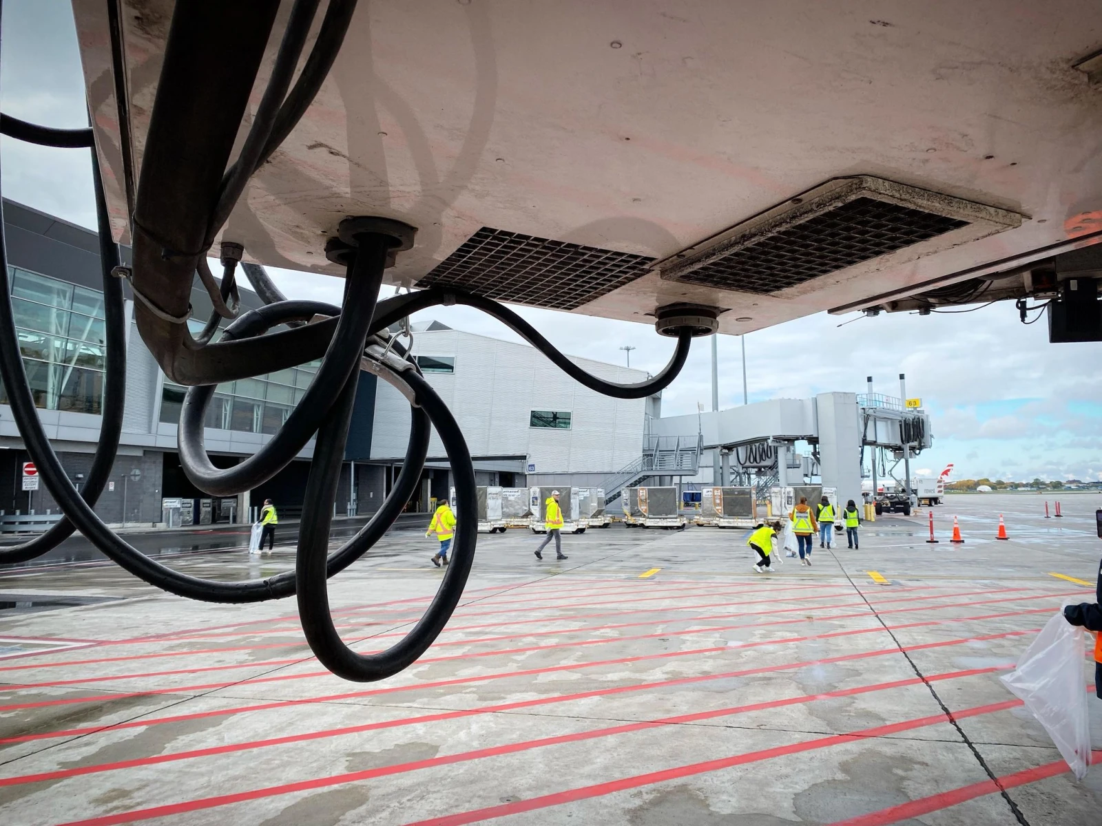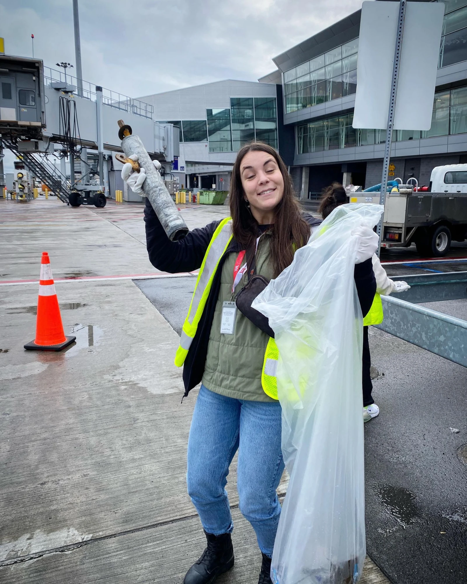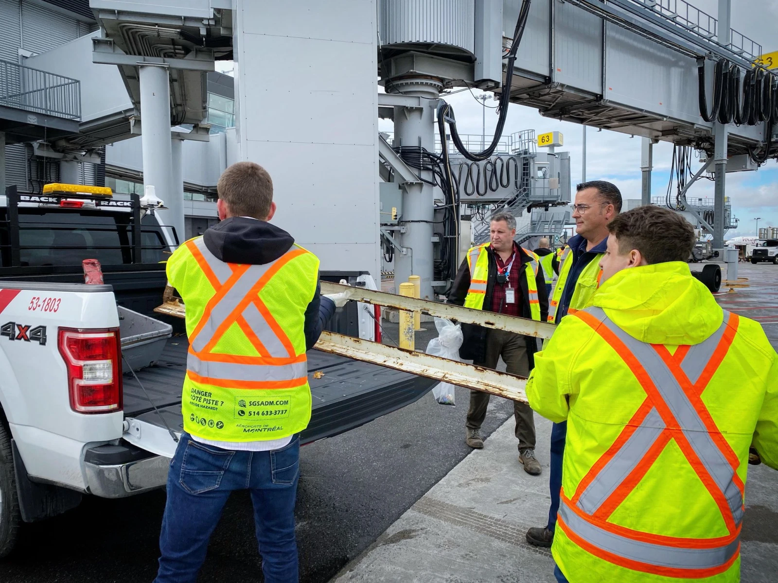 Pendant qu’un avion d’Air Canada accoste à la porte 67 en face de nous, notre équipe continue ses efforts, si bien que l’arrière du camion se remplit rapidement de gros débris trouvés par terre.