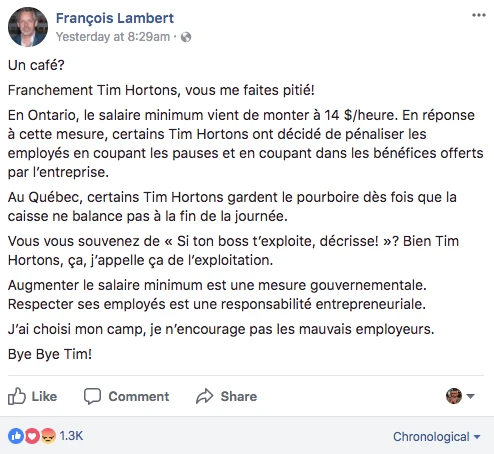 C’est tellement fâchant, même François « pas besoin de syndicats ça existe pas des mauvais boss » Lambert a fait une sortie sur Facebook pour dénoncer la situation:
