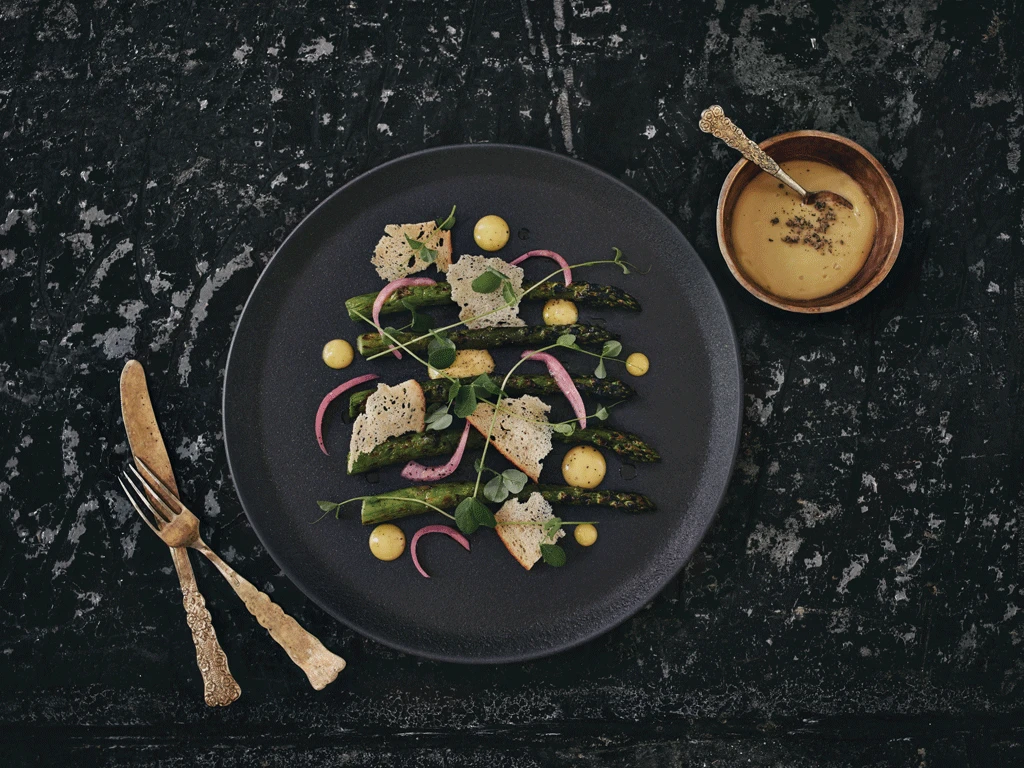 5- Pour L’assemblage, disposer les asperges de façon parallèle dans l’assiette en garnissant aléatoirement de sauce hollandaise, d’oignons marinés, de croûtons, et des vrille de pois.
