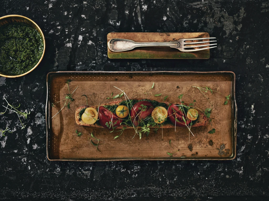 4- Pour le service, tartiner généreusement le croûton de foccaccia du pesto et disposer les tomates dessus, de façon aléatoire. Terminer avec quelques feuilles de cerfeuil en garniture.