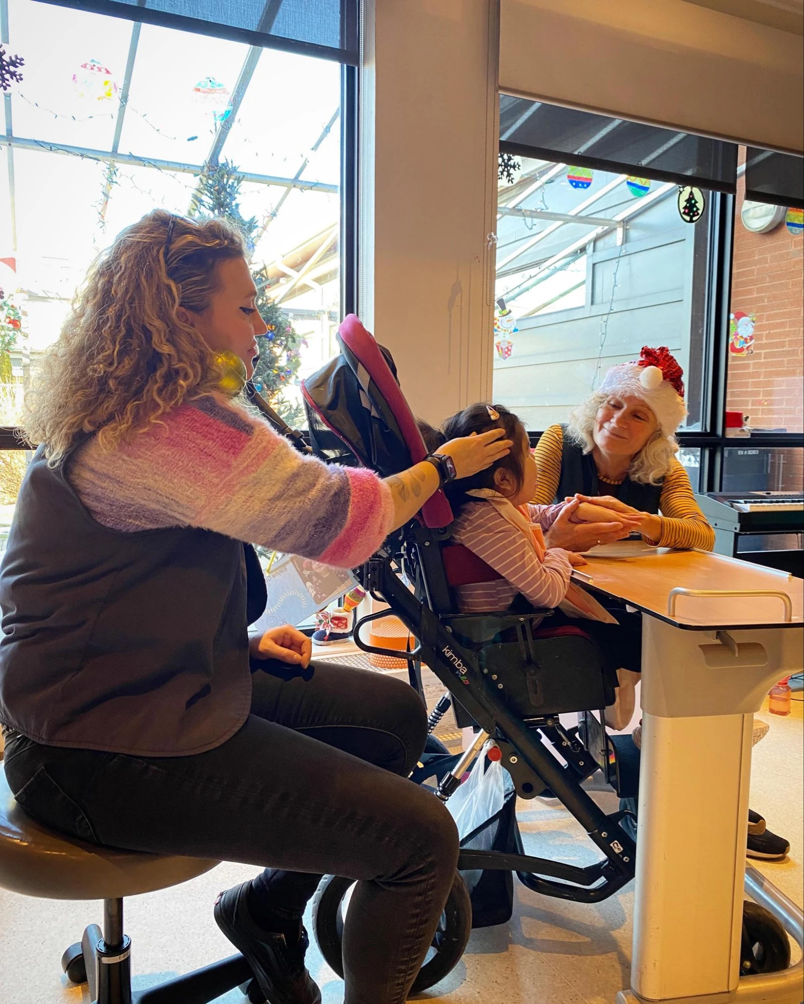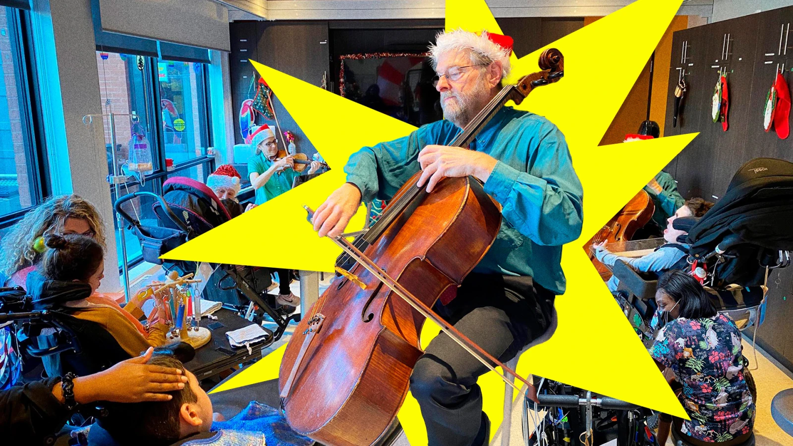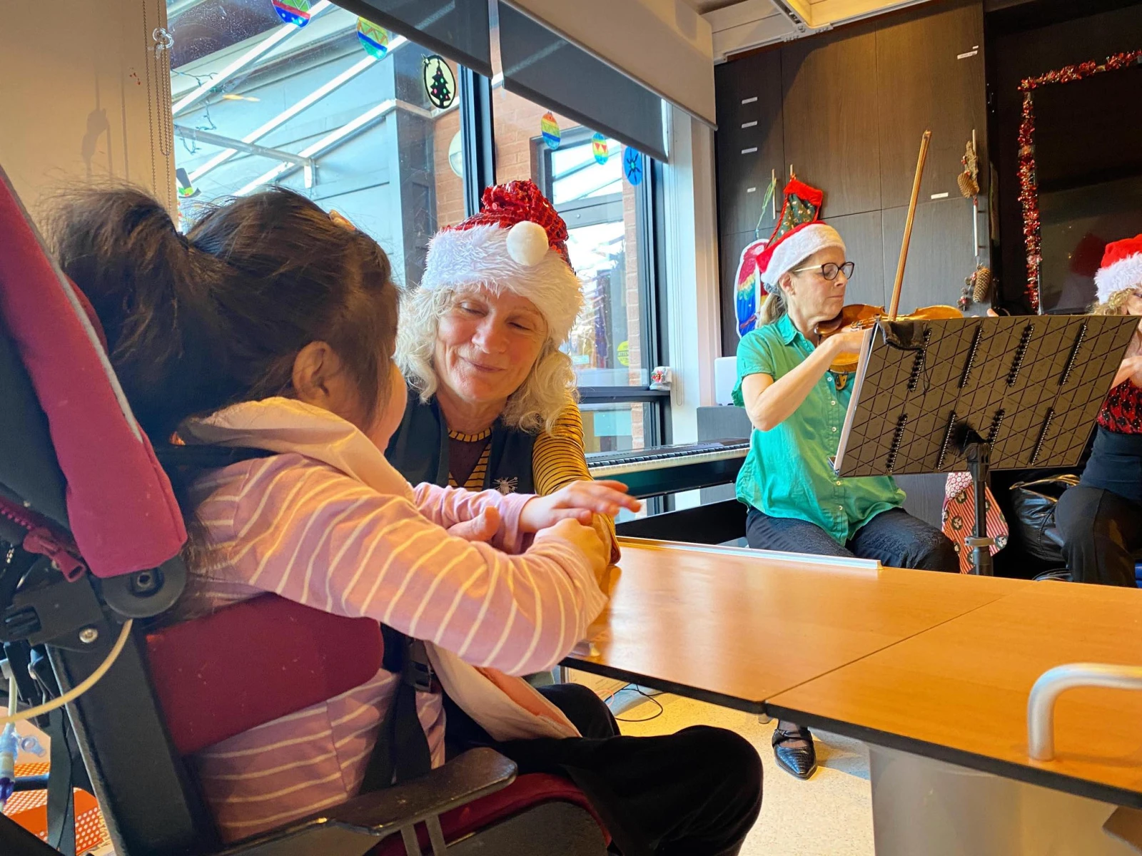 Les musiciens interprètent J’ai vu maman embrasser le père Noël pendant que Brigitte, une bénévole, essuie un peu bave qui s’échappe de la bouche grande ouverte et hilare de Jasmine*. Devant la fillette, la petite Leila, clouée à son fauteuil roulant, agite ses bras et ses jambes énergiquement au son de la musique.