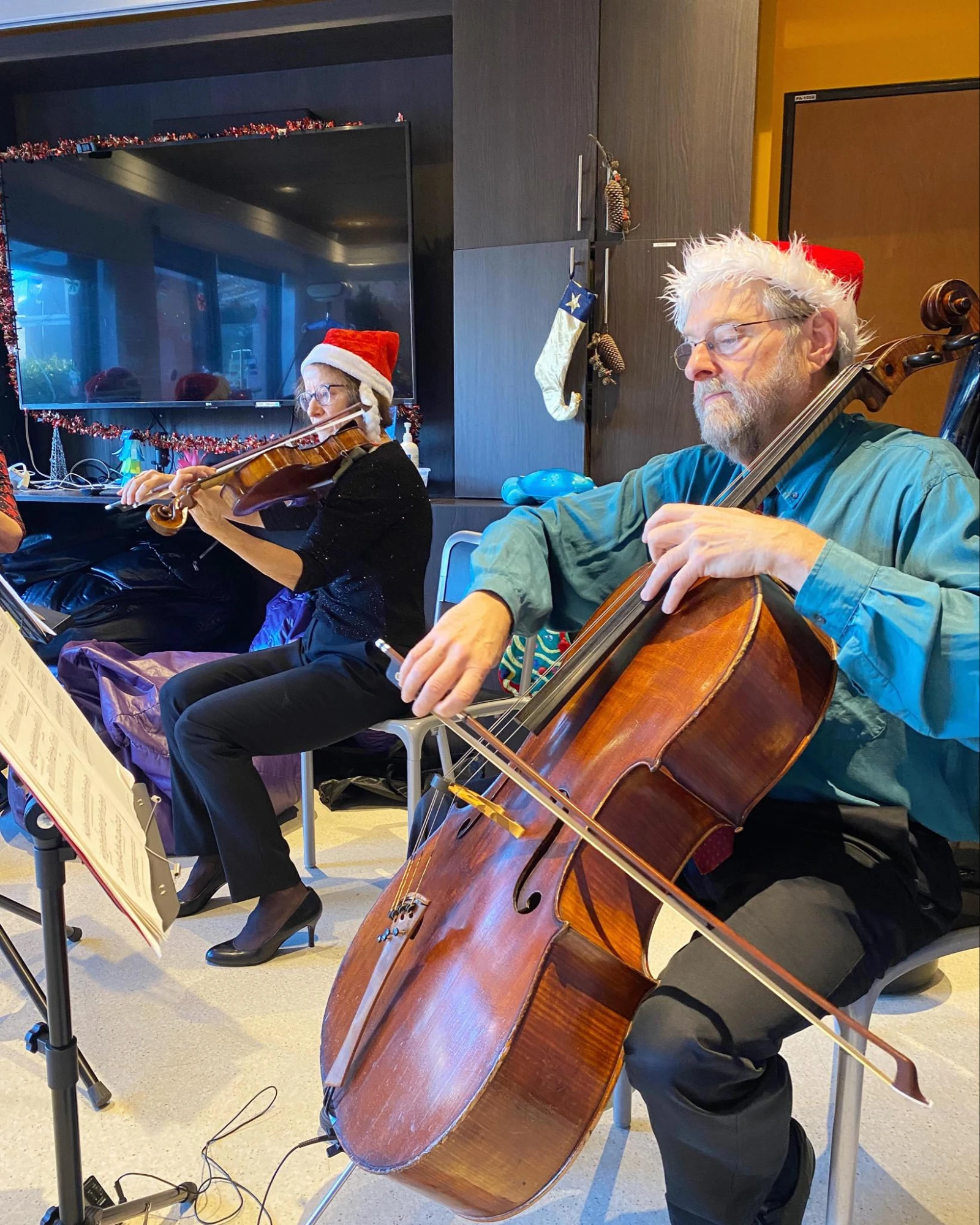 Le spectacle débute dans quelques minutes, les musiciens prennent place dans un salon radieux, décoré aux couleurs de Noël, avec, notamment, une arche gonflable.