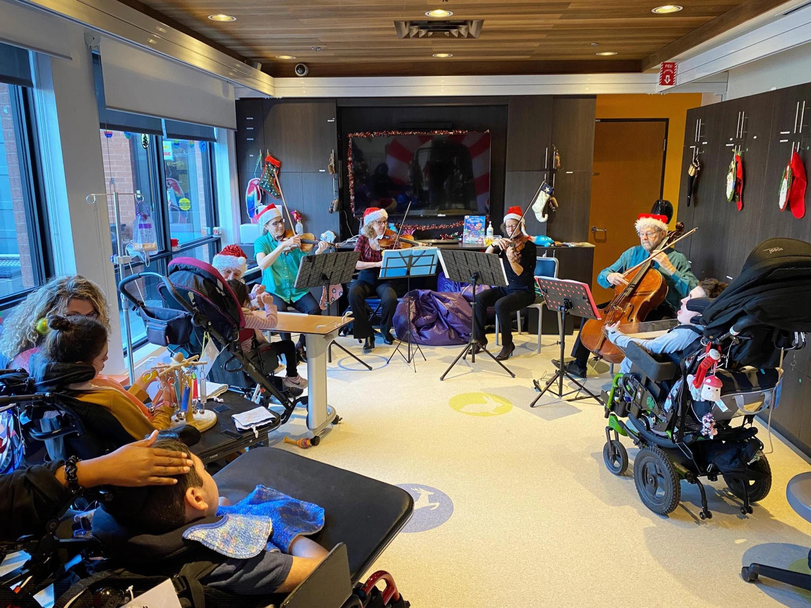 Les enfants – tous en fauteuil roulant – sont disposés en demi-lune en face des artistes coiffés d’une tuque de circonstance, qui terminent d’accorder leurs instruments.