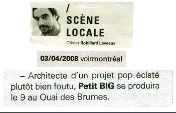 L’animateur et chroniqueur Olivier Robillard Laveaux aussi revendique avoir vécu les belles années du Voir, celles qui ont vu naître plusieurs musiciens et bands formidables sur la scène locale. « Malajube, Karkwa, Arcade Fire, Patrick Watson: on a vu l’évolution de ces bands, reçu leurs démos et vu leurs stunts sur de petites scènes », souligne, l’animateur de l’émission Déjeuner en paix sur les ondes de Ici Musique, qui a couvert une décennie au Voir (2002 à 2012), notamment comme chef de la section musique. « Comme on était les premiers à parler de ces nouveaux bands, on développait des complicités avec eux. C’était une belle époque », admet Olivier, citant en exemple un long pique-nique avec le chanteur de Malajube, une soirée intime au Café Sarajevo avec un pianiste encore inconnu nommé Patrick Watson, mais surtout un jam improvisé avec Arcade Fire. « Leur drummer était en retard et je l’avais remplacé en attendant. On avait fait un cover de Bowie (Five Years). J’étais plus nerveux qu’autre chose », raconte Olivier, qui a vu l’aura mythique du Voir s’effriter au cours des années. « Dans les années 90, faire la une du Voir, c’était comme aller à Tout le monde en parle. Quand je suis parti en 2012, on sentait déjà qu’il était trop tard », résume Olivier.