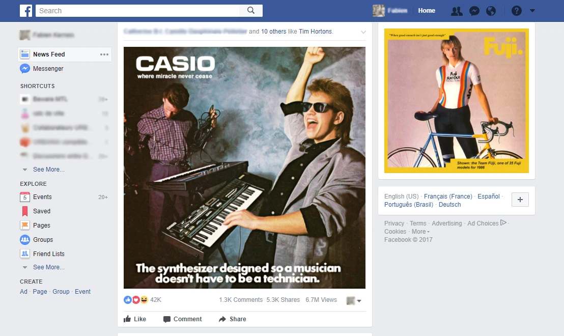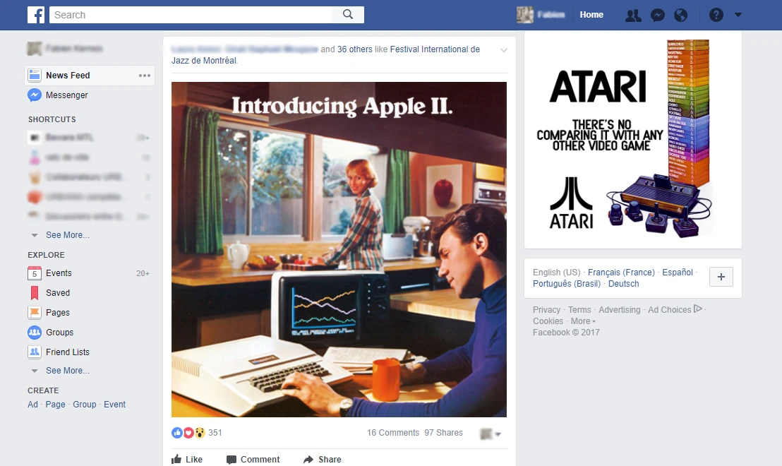 Mais pour éviter d’avoir à faire plus ou moins ce que ce mec fait, je me donne des breaks de temps en temps grâce au plug-in «Vintage ads are cool». Installé en 3 clics, le plug-in recouvre toutes les publications sponsorisées de Facebook avec des vieilles annonces, comme celle de la sortie de la console Atari ou du deuxième ordinateur Apple (années 70-80). Puis pendant quelques heures, je refais ma culture publicitaire des années 80.