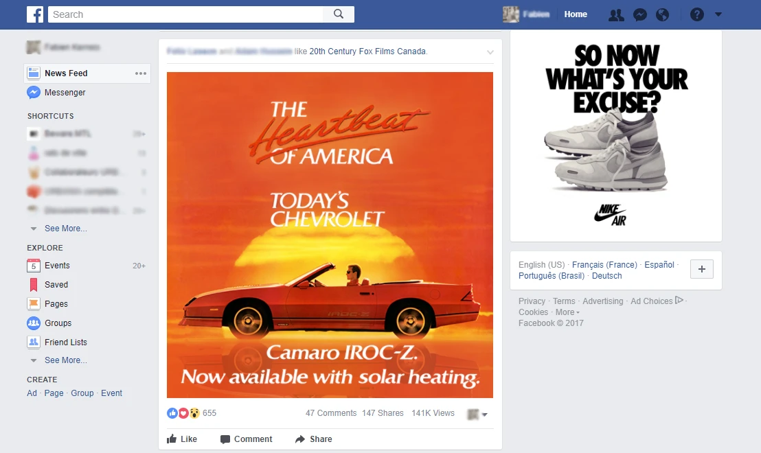 En tant que gestionnaire de communauté/«mec qui passe sa vie sur Facebook», j’ai développé une résilience extrême aux publicités présentes sur la plateforme de stalkage. Comme si mes yeux anticipaient les publicités et descendaient plus vite à chaque pub, tout en coordonnant un scrollage plus rapide.
