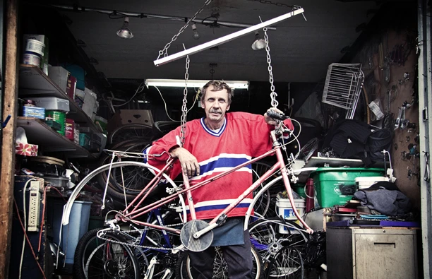 Le garage de bicycles à Renaud, c’est le Gaz Bar Blues de Hochelaga. Dans un puissant esprit communautaire, une vingtaine d’habitués s’y réunissent chaque soir. Véritable Père Teresa (en plus funny), Renaud donne du travail à l’alcolo du coin, des croquettes aux chiens de la ruelle, ainsi que des Timbits et des bicyclettes aux enfants.