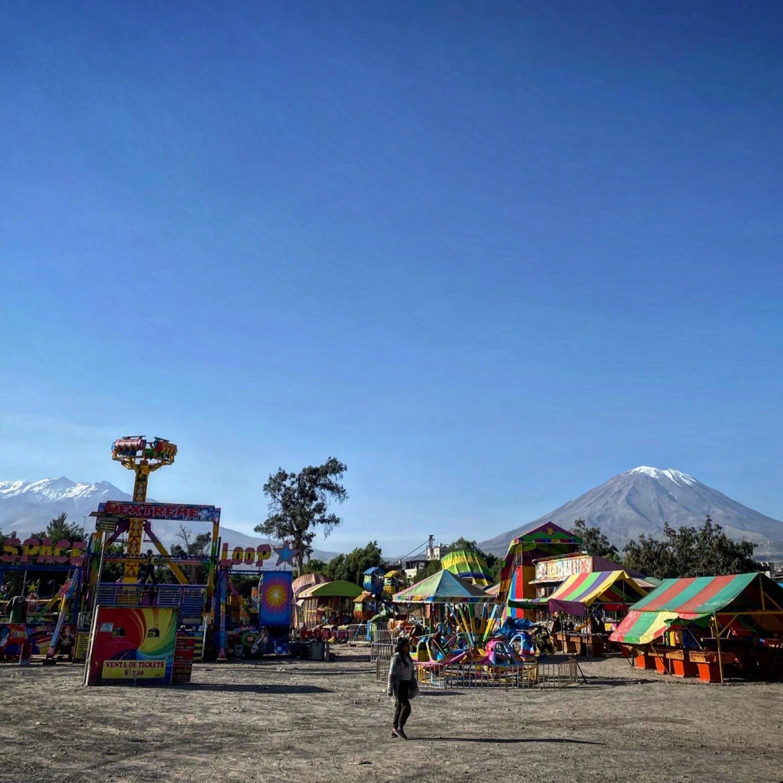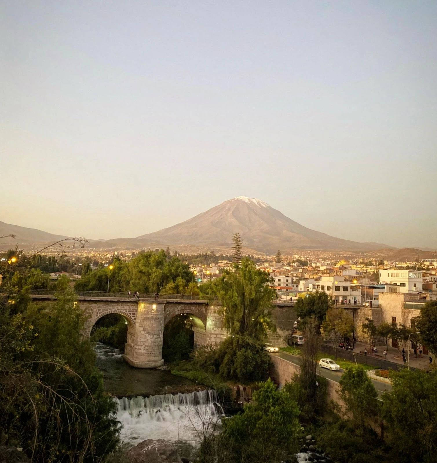 Nous avons eu le temps de faire une saucette dans les environs. Pas de farce, c’est grandiose avec la petite chute qui traverse la ville, les fortifications moyenâgeuses au centre-ville et les trois volcans (Misti, Chachani et Pichu Pichu) à l’horizon.