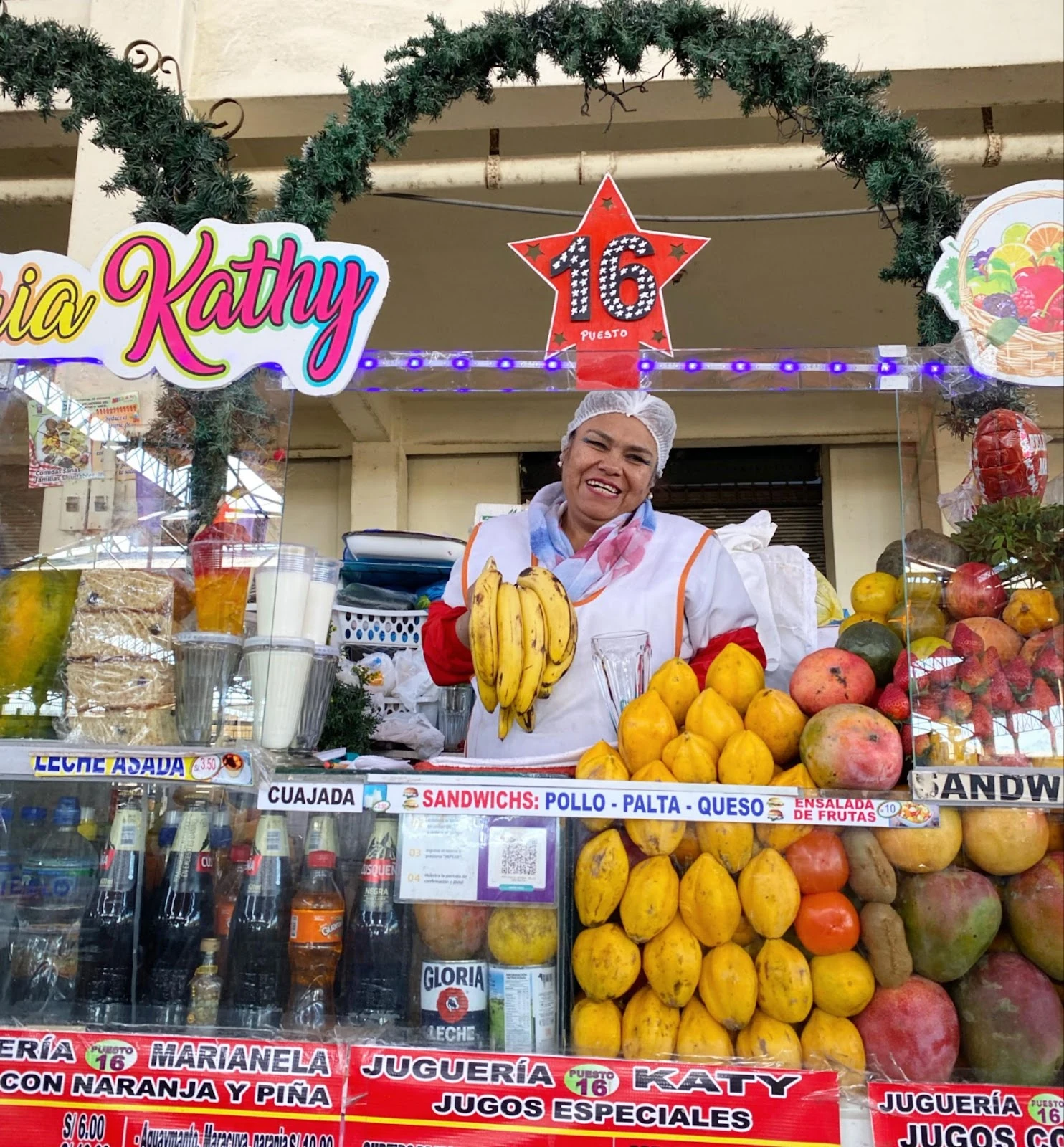 Empanadas, pâtisseries, tamales, fruits mûrs, maïs, pollo con arroz : il est possible de se nourrir exclusivement dans les étals dispersés à travers la ville et pour des peanuts.