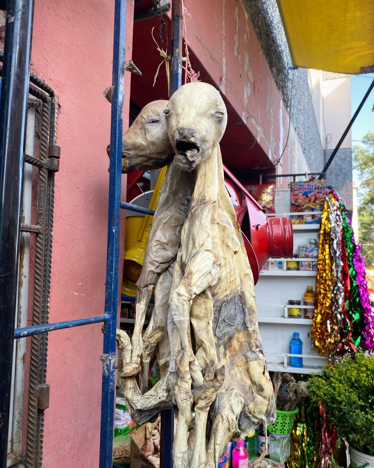 Nous n’étions pas encore au bout de nos dégueulasseries, puisque nous avons remarqué au retour que plusieurs échoppes exhibaient à leur marquise des carcasses de jeunes taureaux – des porte-bonheurs, m’a expliqué un commerçant. Plusieurs utilisent des reproductions en céramiques, une crisse de bonne affaire parce que ce sont des images qui ne sont pas pressées de sortir de ta tête.