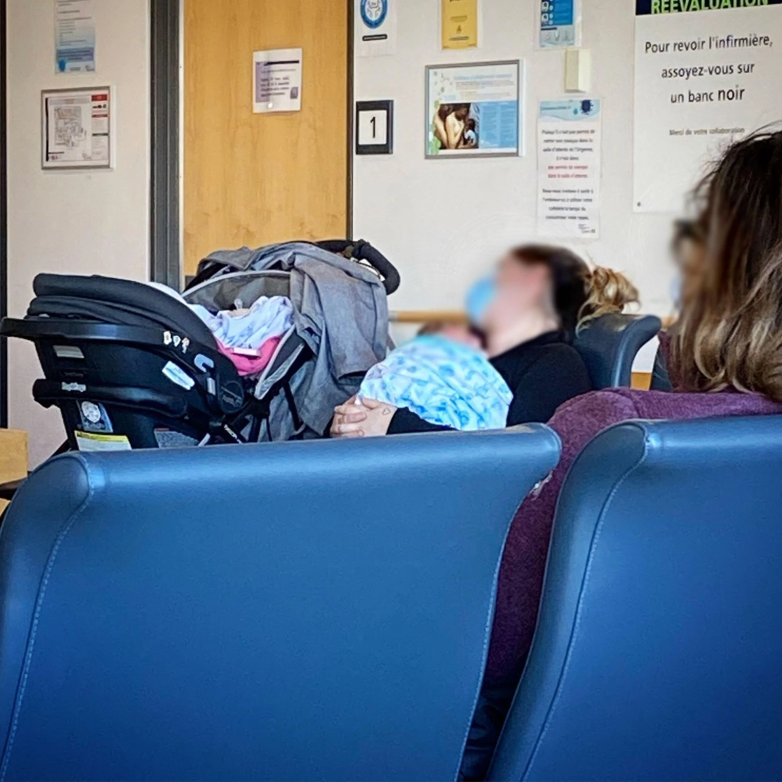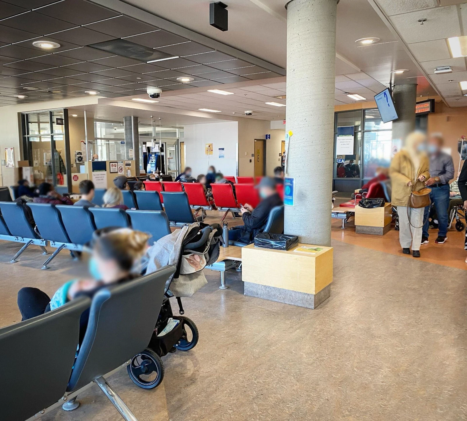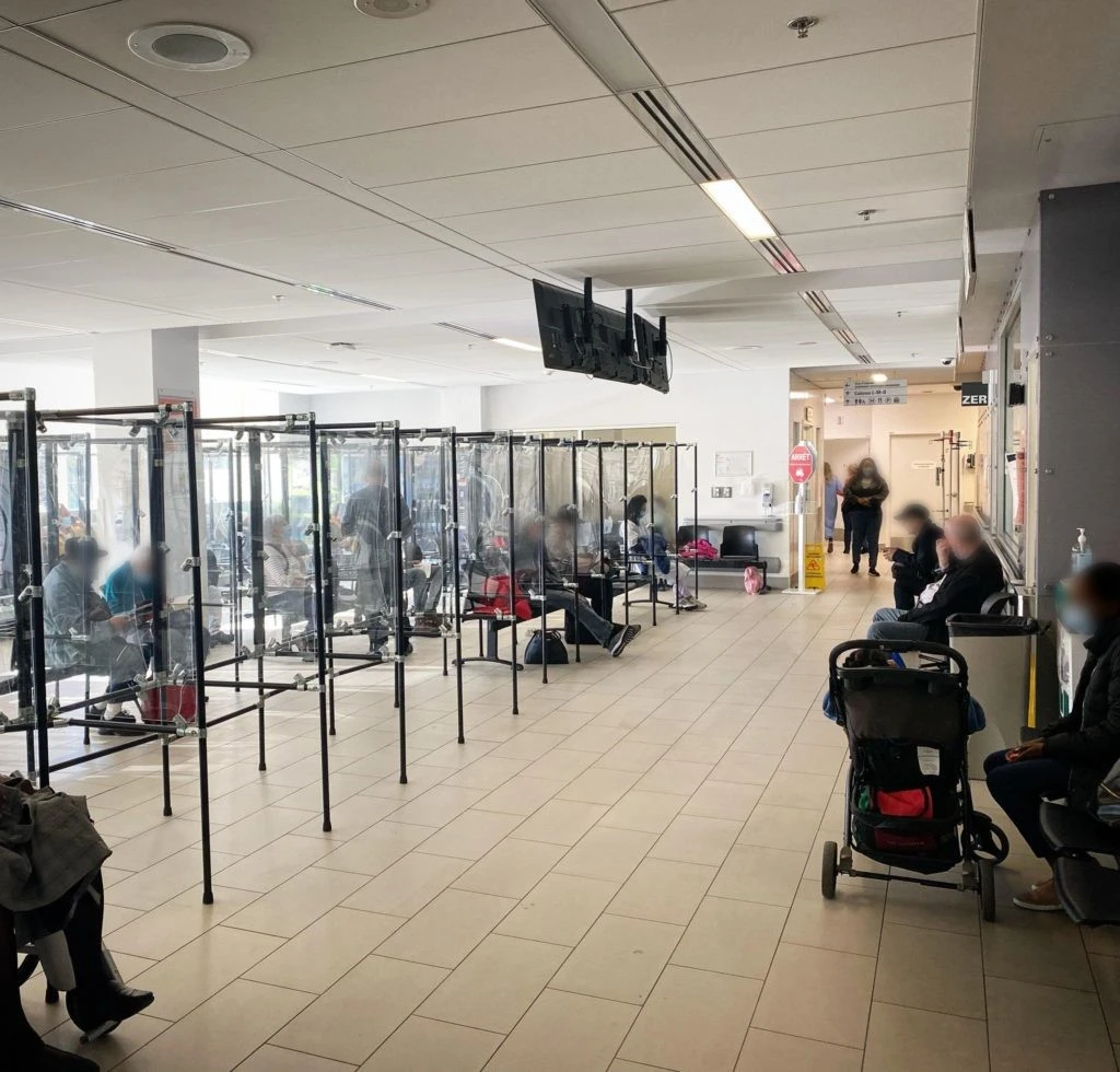 La salle d’attente est bondée, ça tousse, des bébés pleurent et des gens sont étendus sur des banquettes devant les grandes fenêtres. Il y a aussi une salle attenante vitrée, pour les patient.e.s qui ont des symptômes plus contagieux. Un agent de sécurité quadrille les lieux, aux aguets, exhortant à l’occasion les délinquant.e.s à remonter leur masque. Près du poste de triage, des paramédics poussent à intervalle régulier des civières à l’intérieur du centre hospitalier congestionné.