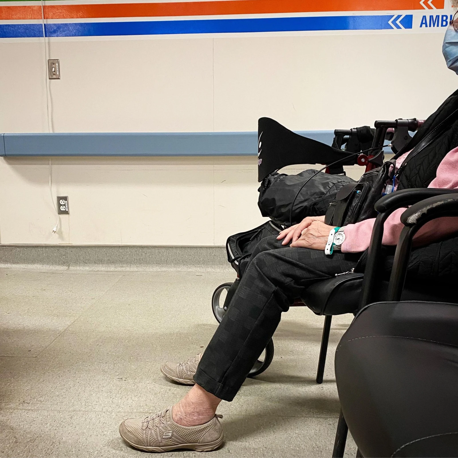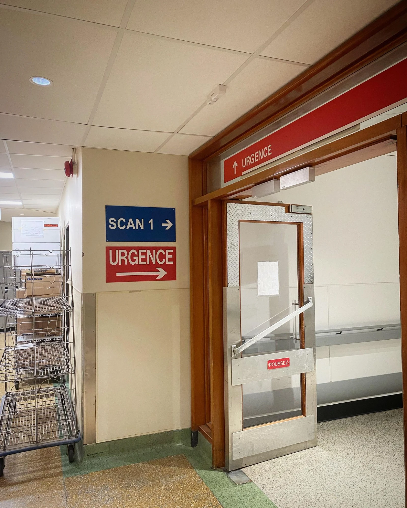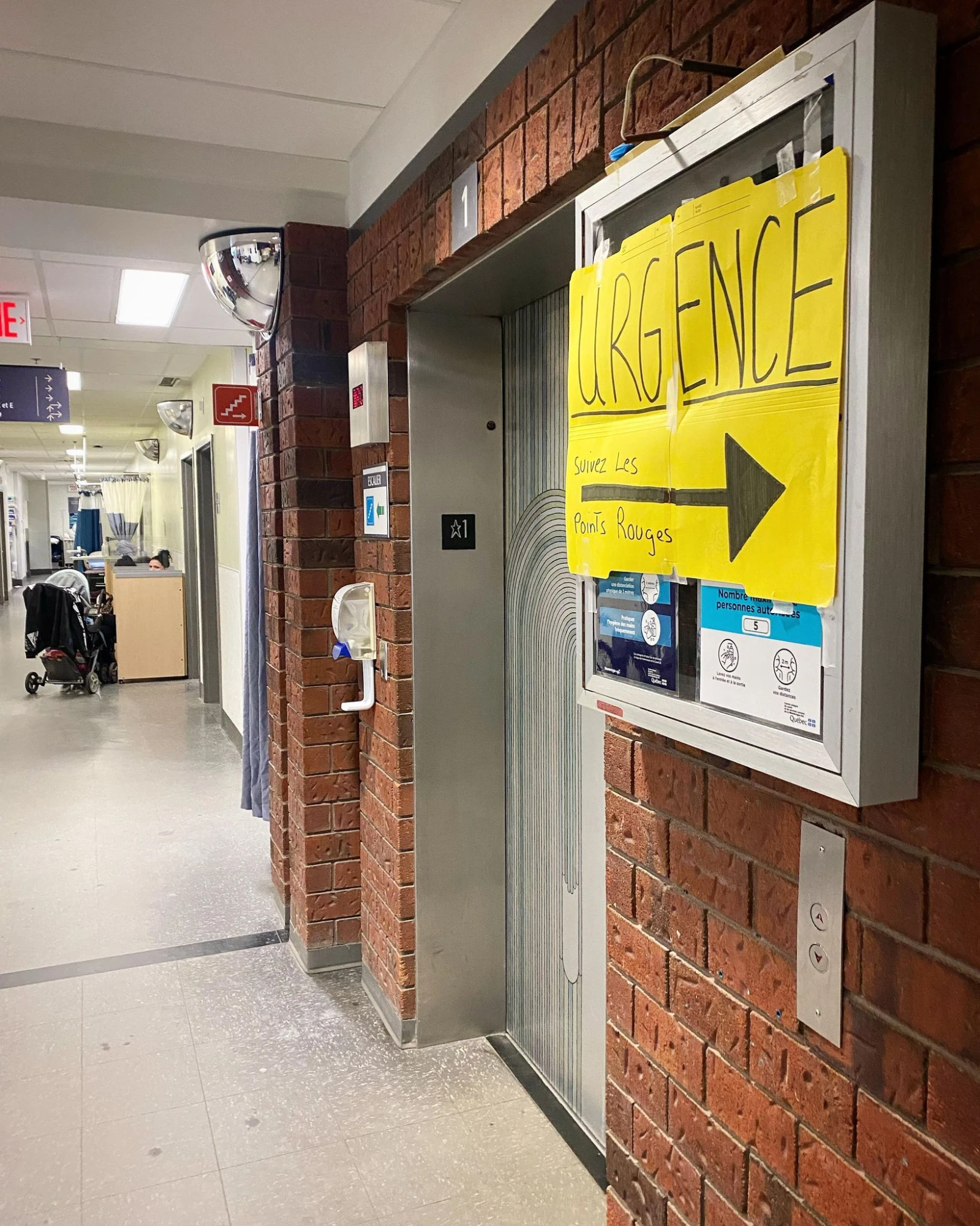 La salle d’attente est bondée, ça tousse, des bébés pleurent et des gens sont étendus sur des banquettes devant les grandes fenêtres. Il y a aussi une salle attenante vitrée, pour les patient.e.s qui ont des symptômes plus contagieux. Un agent de sécurité quadrille les lieux, aux aguets, exhortant à l’occasion les délinquant.e.s à remonter leur masque. Près du poste de triage, des paramédics poussent à intervalle régulier des civières à l’intérieur du centre hospitalier congestionné.