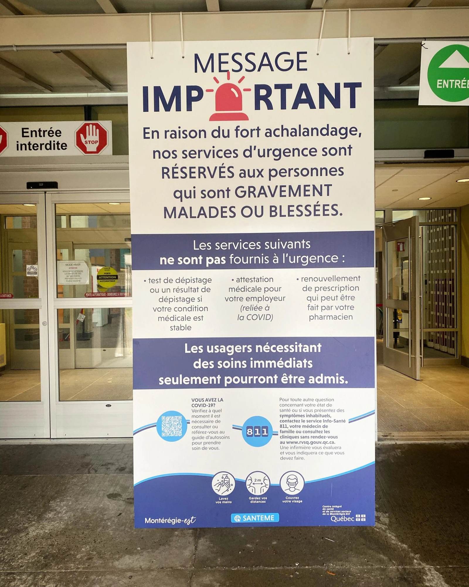 « Message important : en raison du fort achalandage, nos services d’urgence sont réservés aux personnes qui sont gravement malades ou blessées », peut-on lire sur une immense pancarte à l’entrée de l’hôpital Pierre-Boucher à Longueuil, dont le taux d’occupation de l’urgence dépasse 100 % (tous les lits sont occupés et une vingtaine de séjours dépassent les 24 heures).