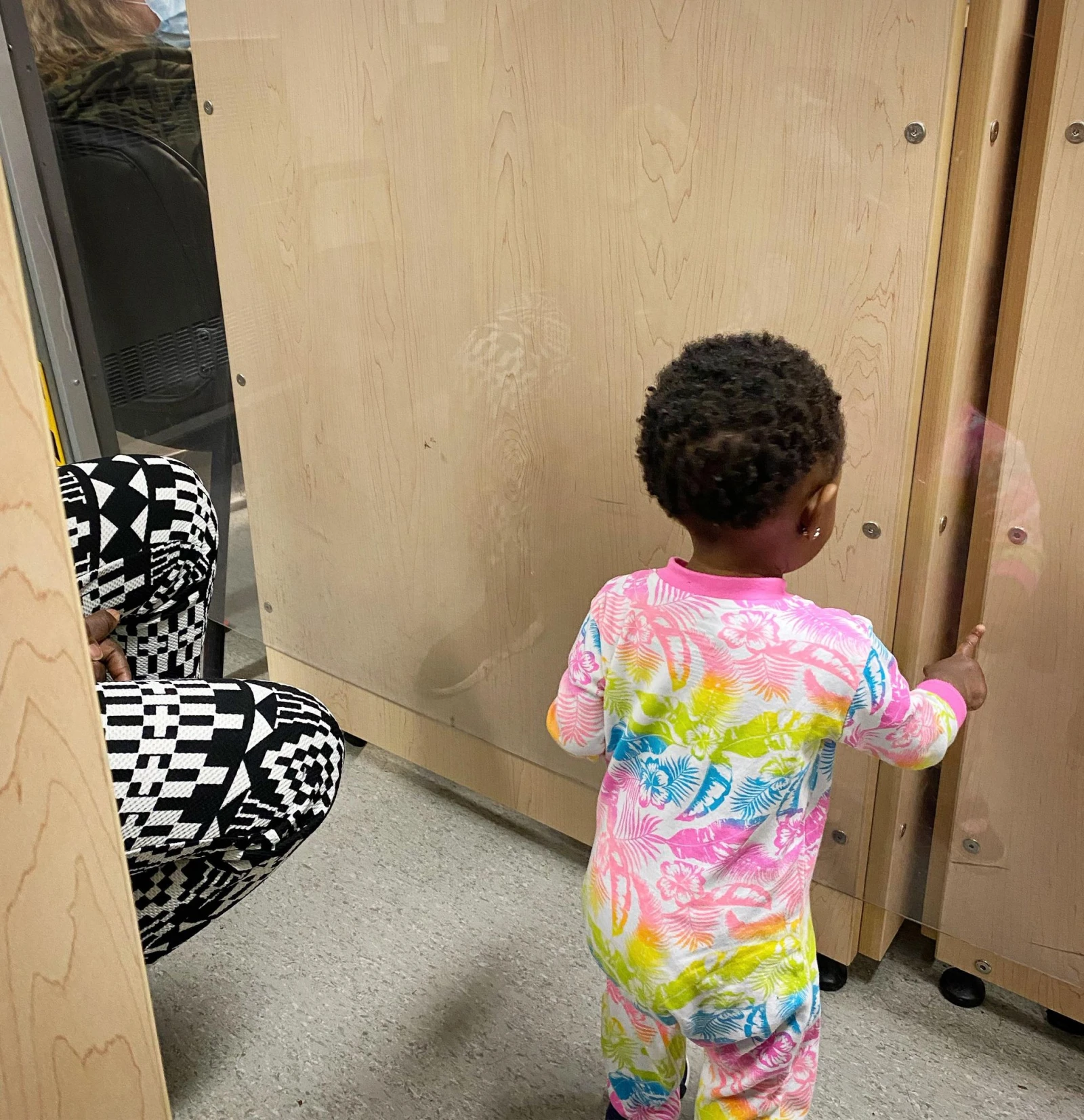 À l’autre extrémité de la salle, une petite fille se tortille d’inconfort, couchée sur son père qui parle au téléphone depuis mon arrivée.