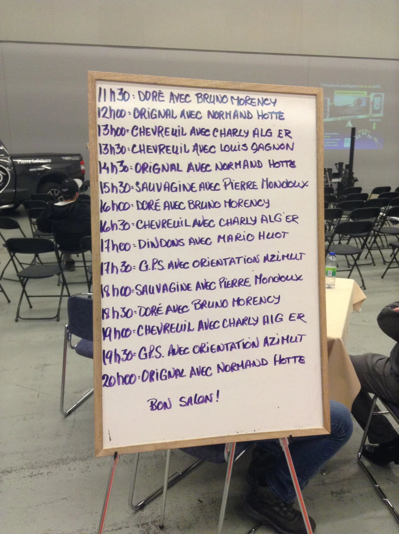 17h48 : un représentant d’Orientation Azimut nous parle de GPS avec un franc-parler déconcertant. «Vous devez mettre l’option ‘’précision’’ sur toutes vos pages pour vous éviter de taponner sur votre GPS !» dit-il, la main dans les airs en guise d’intensité.