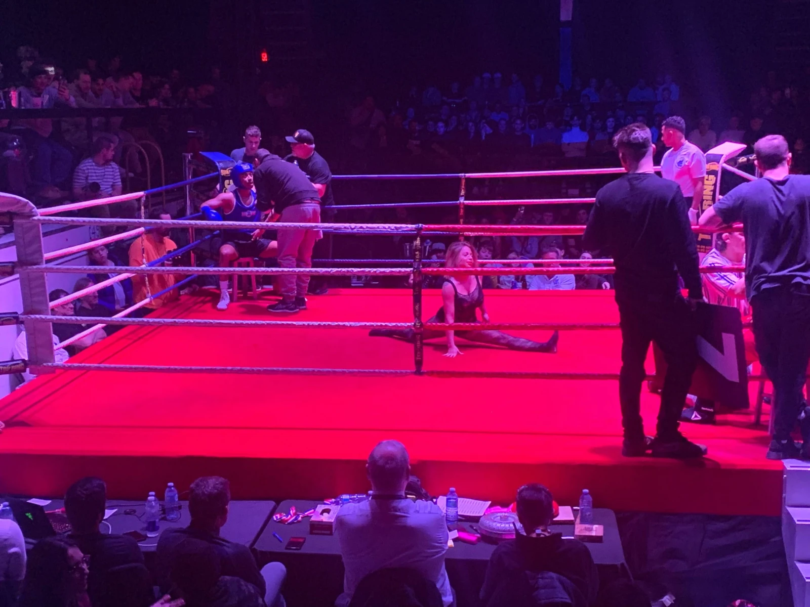 Non, le spectacle le plus étrange de la soirée n’est pas venu des influenceurs, mais bien de la ring girl qui, de combat en combat, a graduellement abandonné ses tâches de la soirée au profit de galipettes pour faire réagir la foule. Twerking, escalade des câbles, chandelle humaine, une split qui aurait rendu jaloux le Luc Senay de l’époque de La Guerre des Clans. Au dernier combat de la soirée, elle avait même arrêté de parader les cartons avec le numéro des rounds.