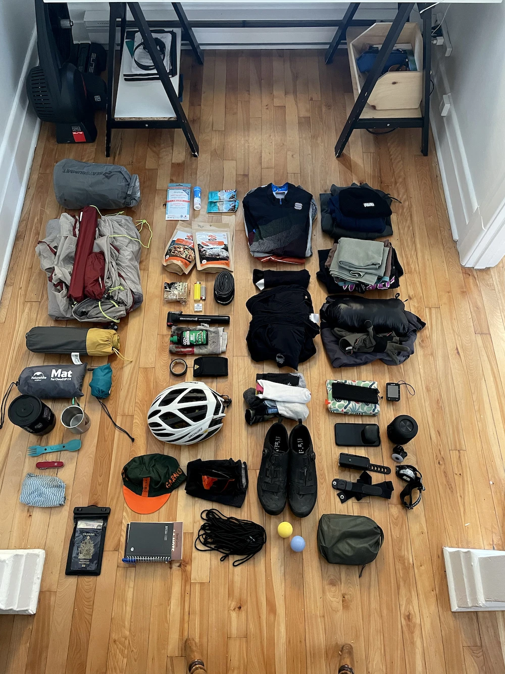Il n’y a pas une seule bonne manière de procéder. Chaque cycliste devra trouver son compte selon les sacs qu’elle ou il a et la quantité de matériel souhaitée. Pour vous donner une idée, voici comment j’ai organisé mon stock pour un récent voyage de cinq jours au Vermont et au New Hampshire, en mai.