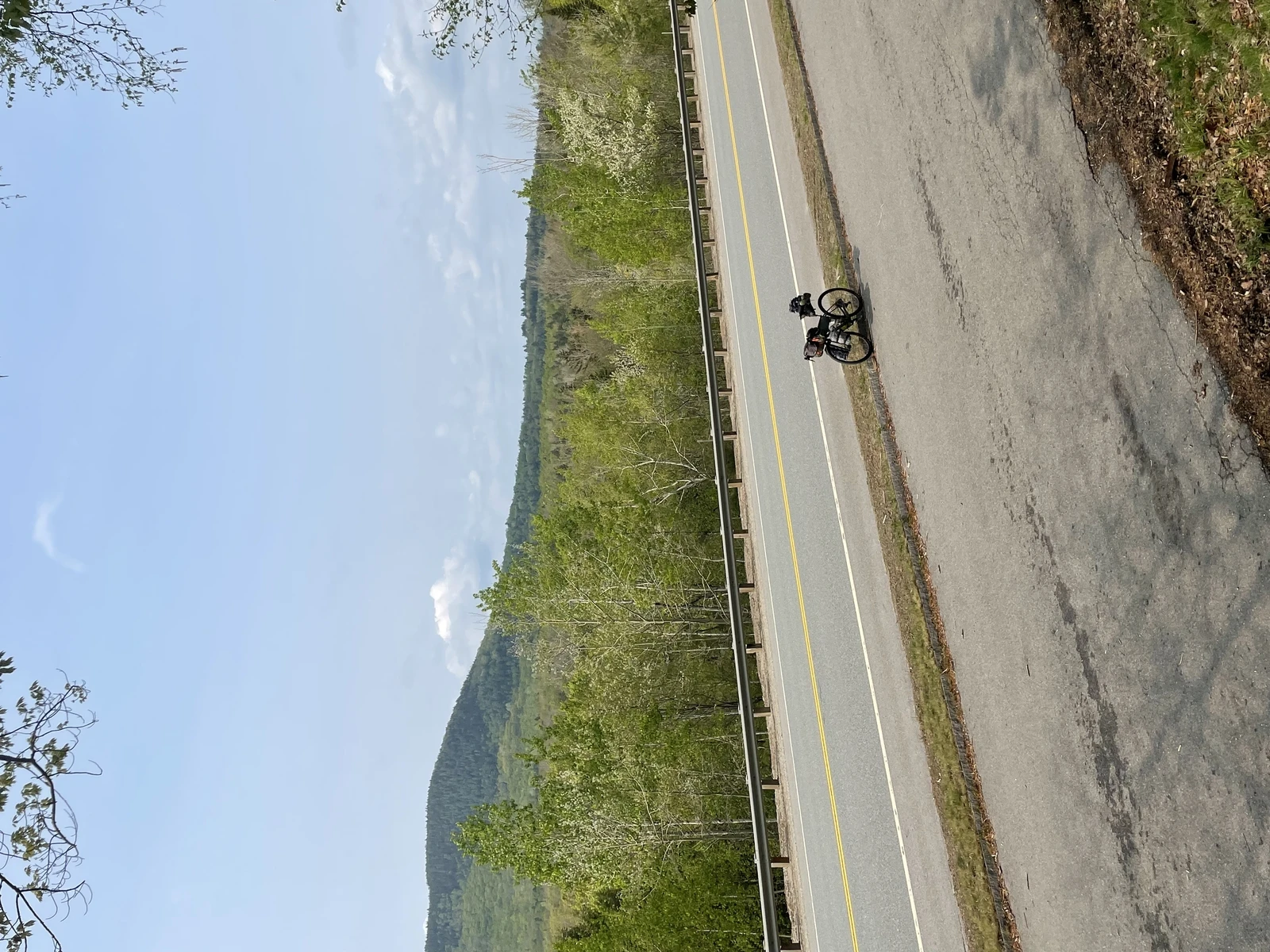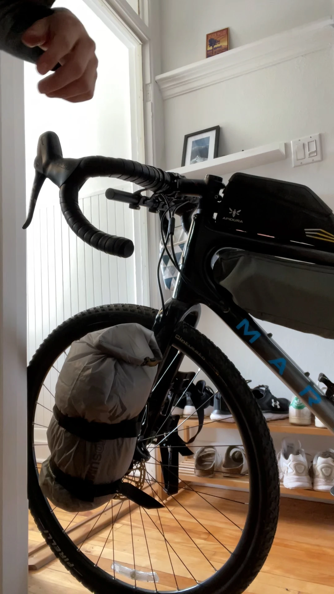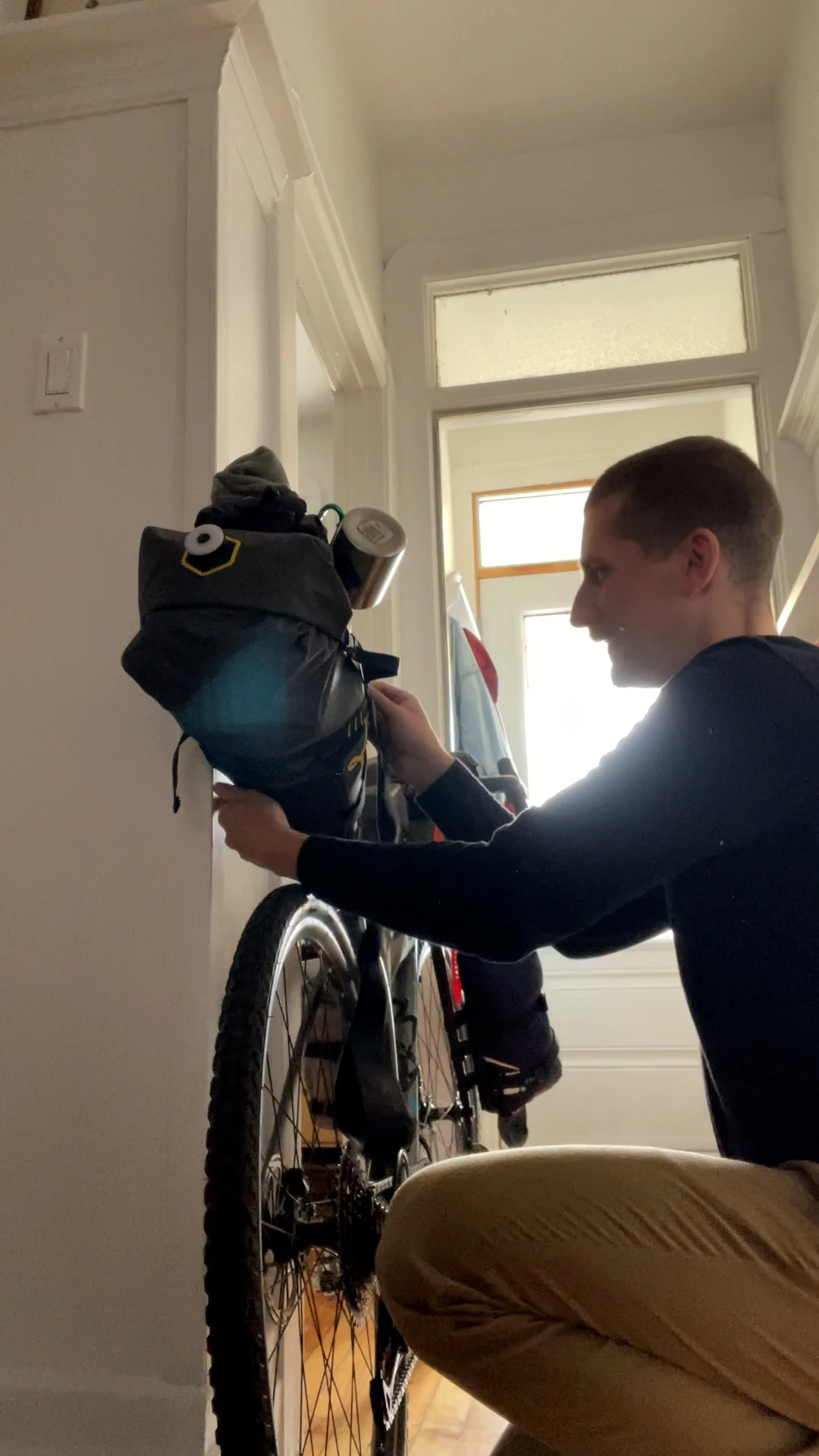 C’est dans ces sacs qu’on peut mettre les articles qui doivent être faciles d’accès pour la journée : des collations, une carte, une batterie pour les appareils électroniques, de la crème solaire, une chambre à air, un multitool… Personnellement, j’ai un petit sac sur le tube supérieur, que je peux ouvrir et fermer sans même arrêter de pédaler, et un second, fabriqué maison, que j’attache sous ce même tube.