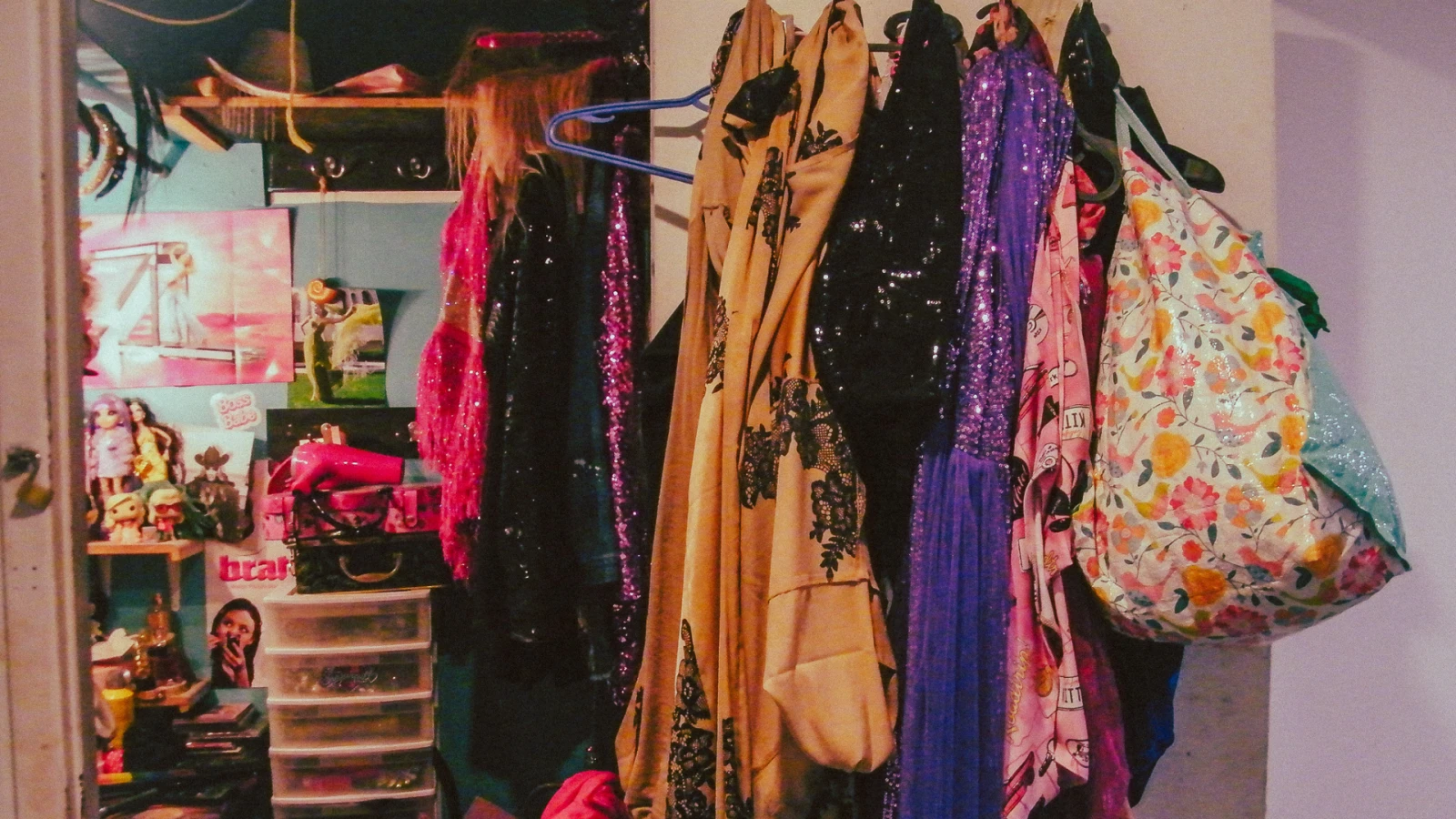 D’un coup, je comprends ce qu’il voulait dire, lorsqu’il disait que le Drague était son safe space. Son bunker pailleté me rappelle l’époque où je visionnais Hannah Montana en boucle ou quand je rêvais d’avoir le casier de Sharpay Evans de High School Musical. Son espace respire les filles et les femmes qui ont coloré ma jeunesse encore récente.