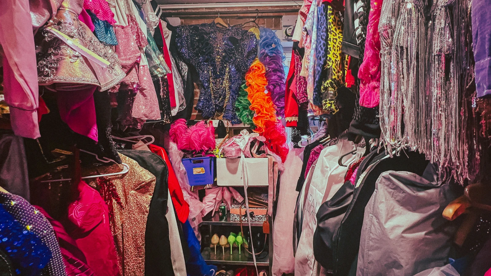 « À côté, c’est l’espace des autres drags. Là, c’est pour les meetings de l’administration et y a les bureaux des boss. Ici, c’est les loges des autres drags maison et là, c’est notre costumier », m’explique Alexandre, les yeux rivés sur les 16 pôles de 7 pieds au bout du corridor qui soutiennent des tonnes de justaucorps pailletés, de boas à plumes et de robes vaporeuses, coincées entre les mille autres bouts de tissus et d’accessoires qui feraient capoter les ados qui magasinent chez Ardène.