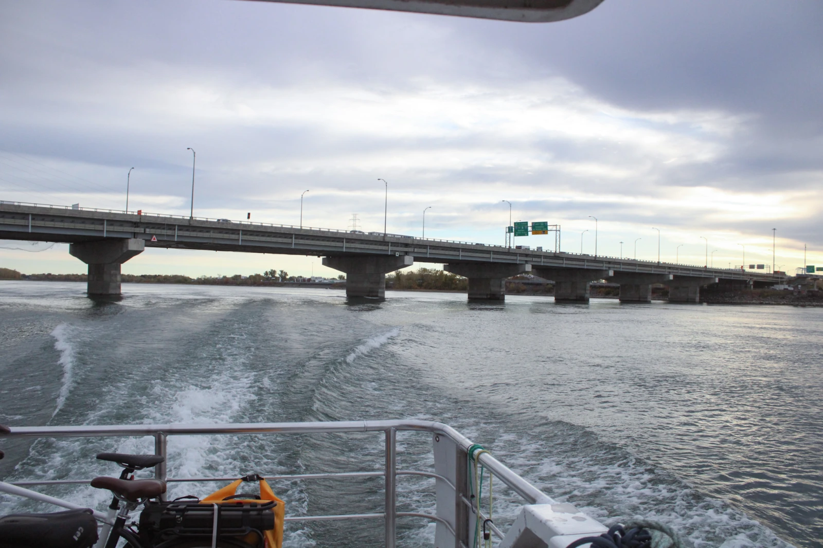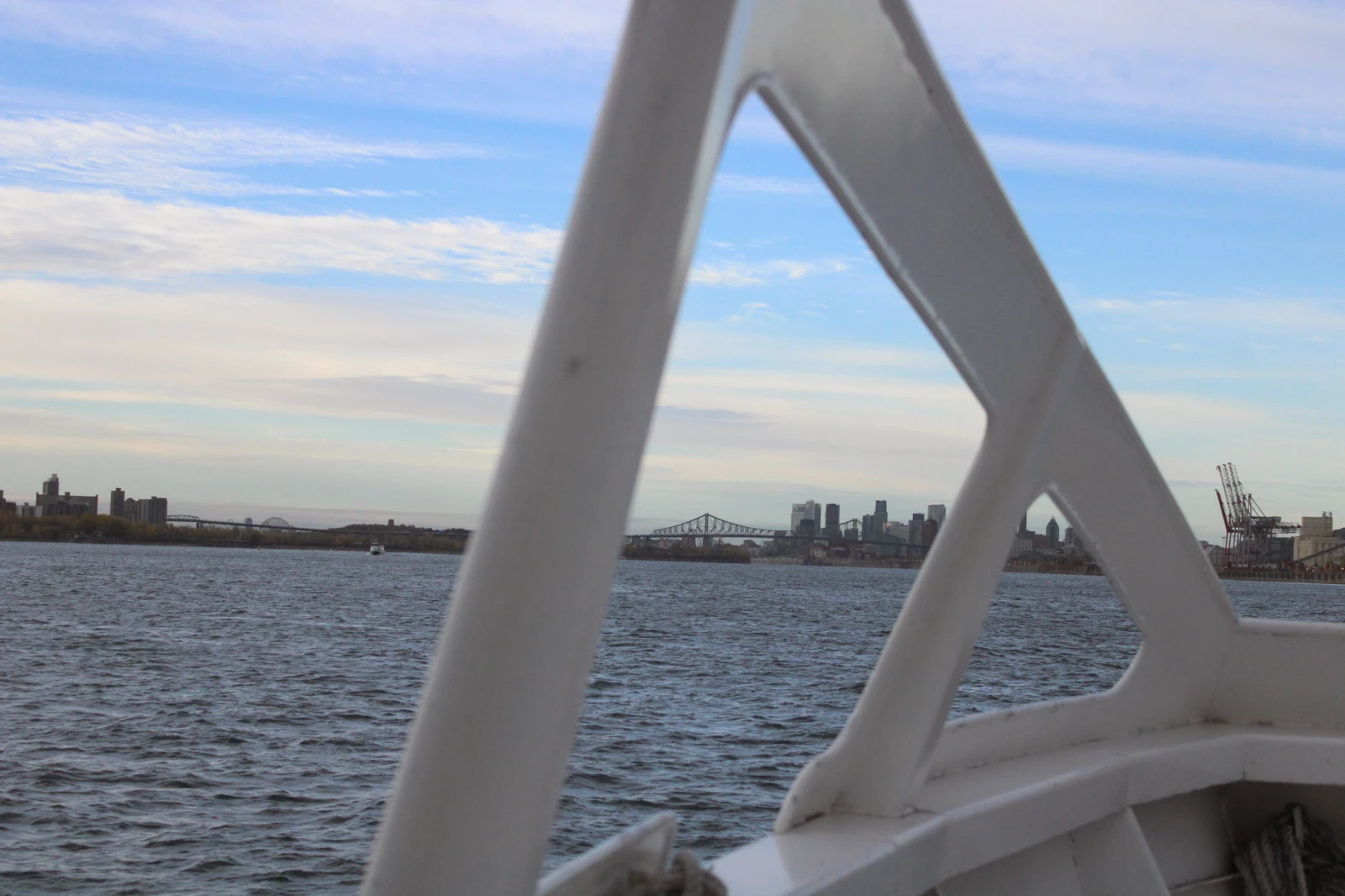 Le bateau passe alors sous le pont Jacques-Cartier – congestionné. Au loin, on aperçoit les tours du centre-ville et le mont Royal.