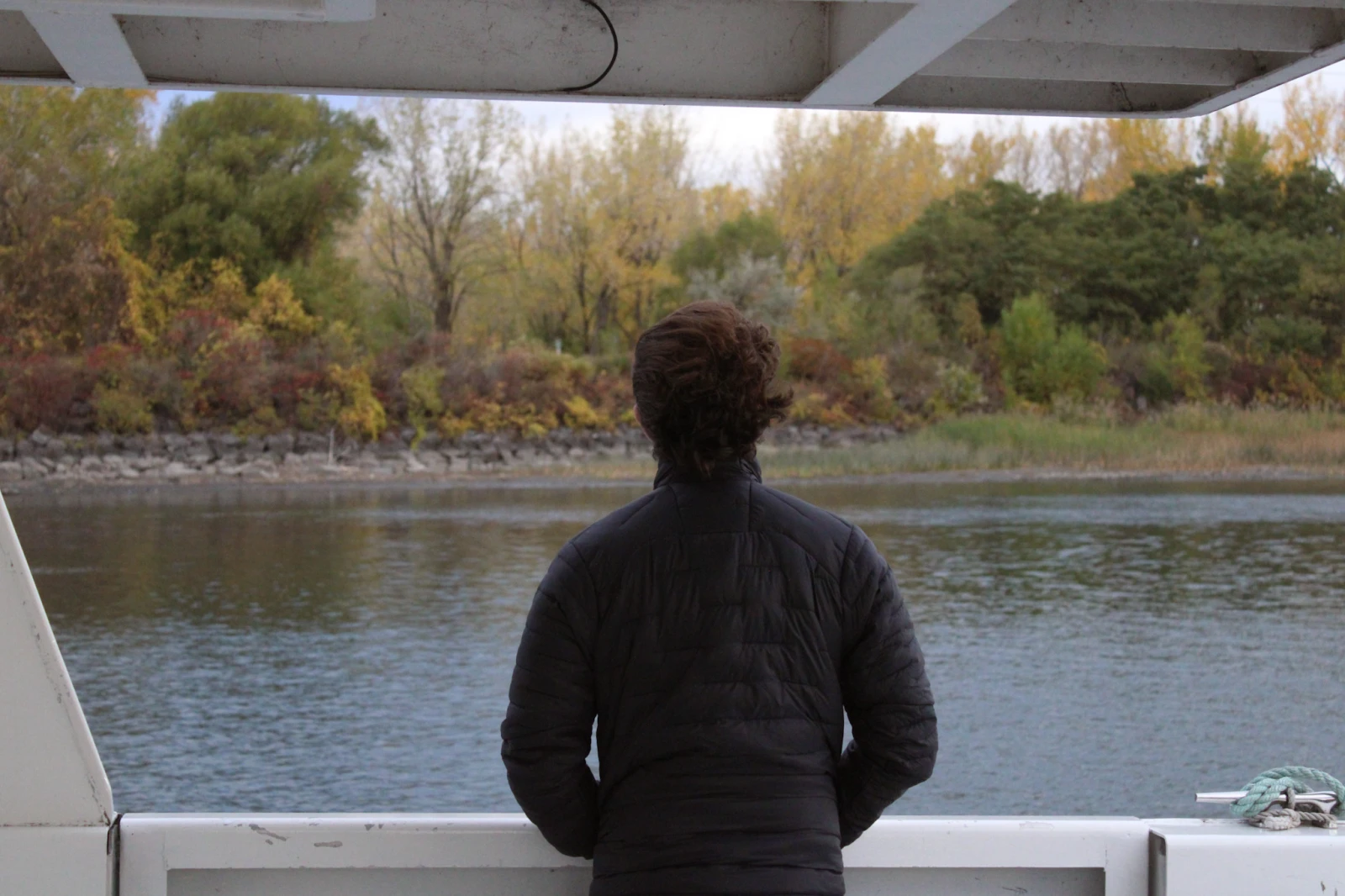 Le bateau longe désormais les rives de Longueuil, avant de poursuivre sa trajectoire vers l’île Saint-Hélène. La majorité des passagers sont assis dans la cabine – chauffante – du bateau, mais certains bravent le froid sur le pont, cheveux au vent.