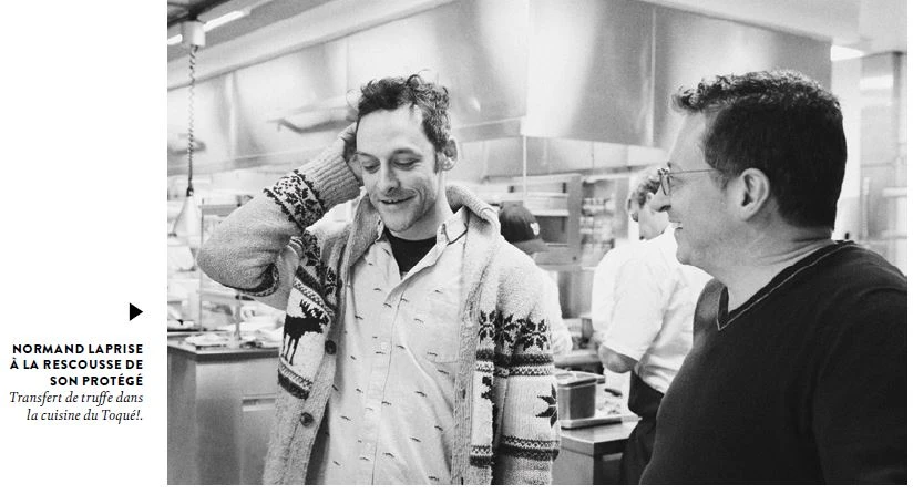 C’est Normand Laprise et sa femme qui nous accueillent au Toqué!. Charlot (comme ils l’appellent) est le parrain d’une de leurs filles, en plus d’être un loyal ami. En apprenant que je fais un portrait de son protégé, Laprise s’empresse de me révéler que la Plaza lui va à merveille : « Des robes de mariées, un sex shop et une animalerie. Il n’aurait pas pu être ailleurs! » (Notons qu’il me tend au même moment un verre de vin et des morceaux de truffe à même la lame d’un couteau. Je suis dans un wet dream de Marie-Claude Lortie.)