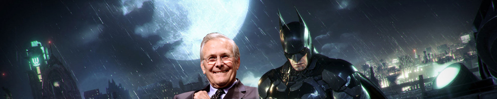 Bon, Batman: Arkham Knight est sorti. Déjà, ça fait beaucoup trop d’heures que je fous sur ce jeu. Alors que j’étais en train de saprer une moyenne mornifle à des truands dans les rues de Gotham, je me suis mis à réfléchir avec qui je pourrais m’imaginer jouer à ce jeu. Comme j’avais déjà pris Denis Coderre, je devais choisir quelqu’un d’autre. J’ai donc pensé à l’ancien Secrétaire à la défense des États-Unis, Donald Rumsfeld.