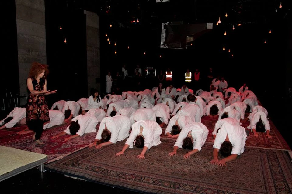 À l’intérieur de la salle de représentation, une séance de yoga nous emmenait à reproduire des positions devant des images de misère. Ensuite, on nous a invité à passer au sauna, où une voix nous a proposé, comme si ce n’était pas déjà évident, de nous mettre dans la peau de quelqu’un qui entre dans un camp de concentration. Puis, en sortant du théâtre sous la pluie, des représentants d’Amnistie Internationale nous attendaient avec des pétitions à signer. Je dirais que c’est là que j’ai décroché si je n’avais pas déjà décroché au moment d’enfiler mon peignoir avec un carré rouge dessus indiquant que j’avais pris le forfait de ceux qui osent se mouiller.