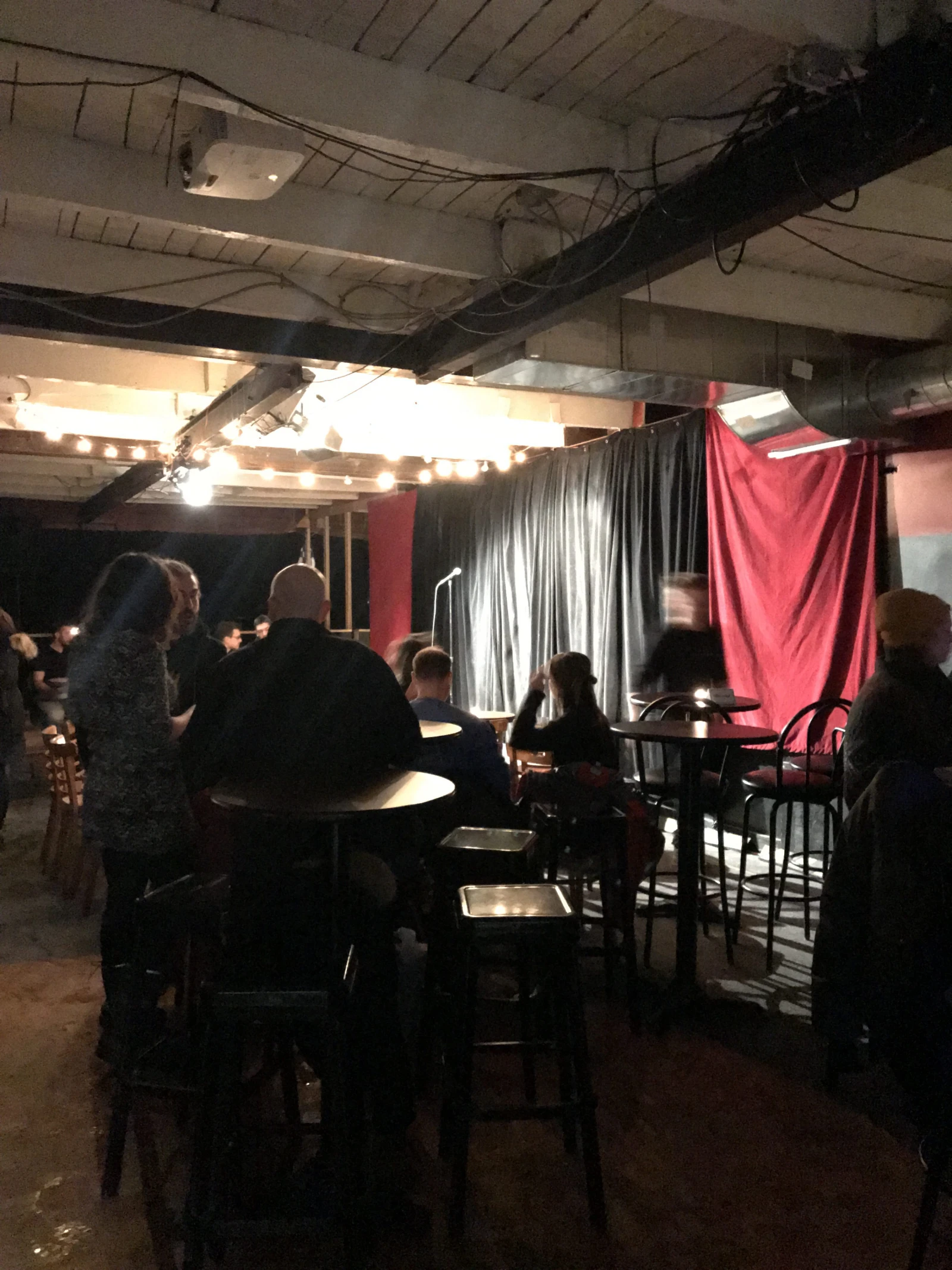 Le spectacle débute à 20h et les portes ouvrent à 19h. Arrivez quand vous voulez, toutes les places sont bonnes. Mon choix s’est porté sur un tabouret haut, accotée à une planche de bois près de la porte d’entrée (là où personne ne veut s’asseoir) : visibilité impeccable malgré la horde de gensses statchée devant moi.