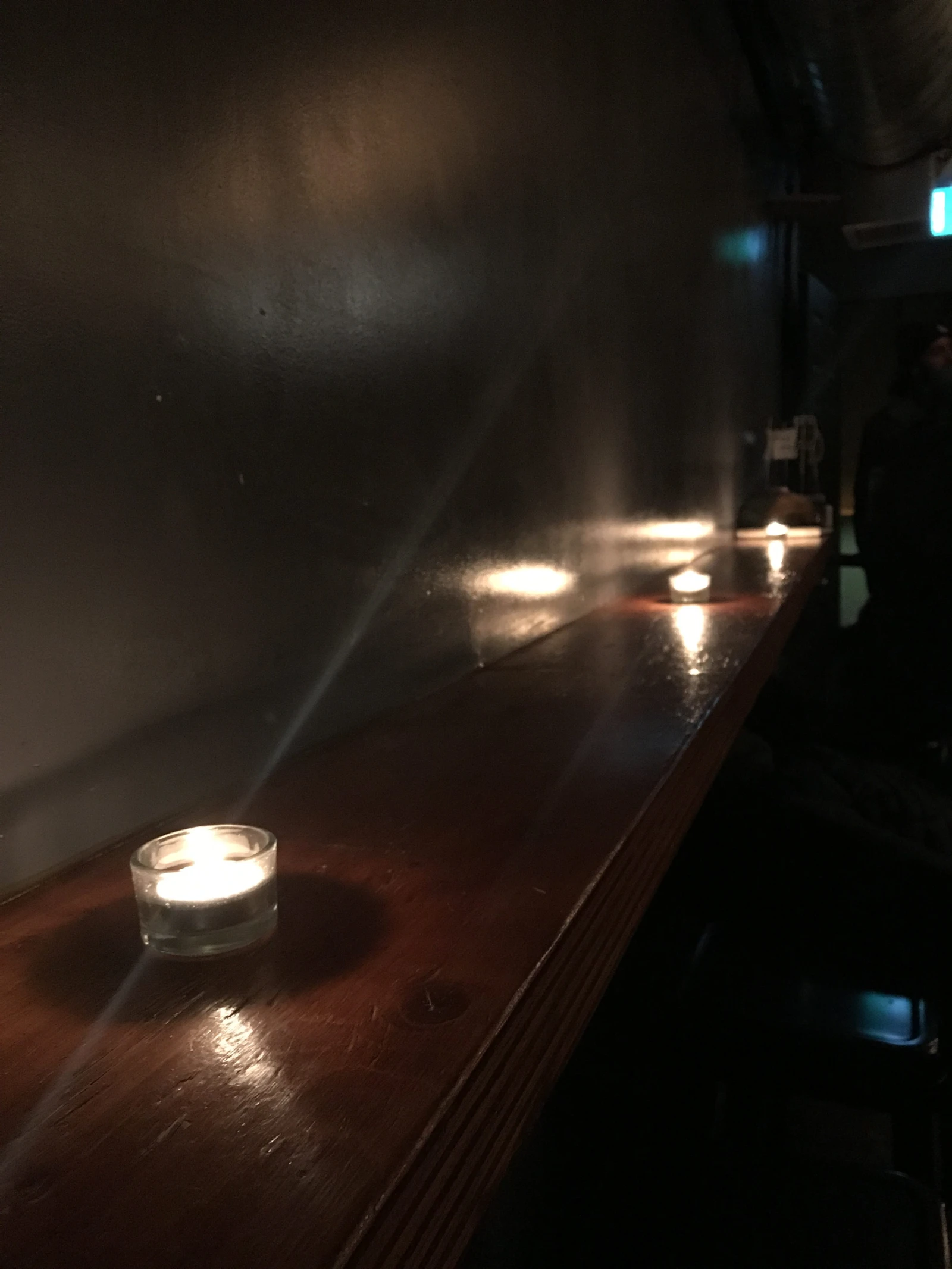 On sous-estime trop souvent ce genre de détails, mais, ayant souvent été obligée de garrocher mon manteau en boule dans un coin comme un torchon de 200$ par manque d’option, je suis assez contente de retrouver des crochets sous la table, véritable sauveur à parka. Heureuse décision, Terminal. De petites bougies contribuent à la vibe très Hygge de la salle, tout comme le gros rideau de velours. Pinterestement plaisant pour l’oeil.
