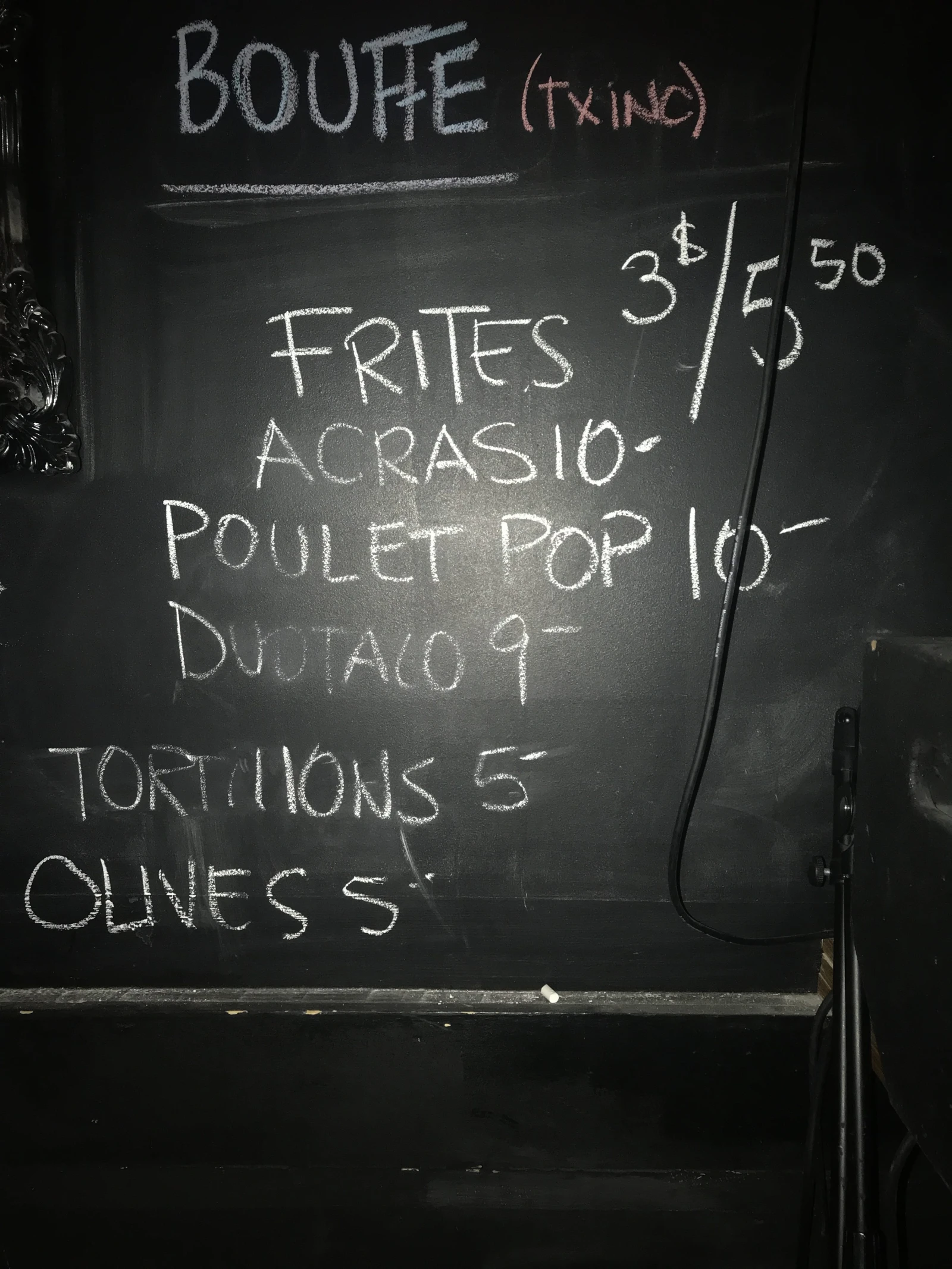 Le chef est un tripeux d’humour, il sait quoi servir aux invités. Des mets qui se mangent en une bouchée, sans décrocher ton regard de la scène, pour en bas de 10 piastres. Bon deal? Bon deal.