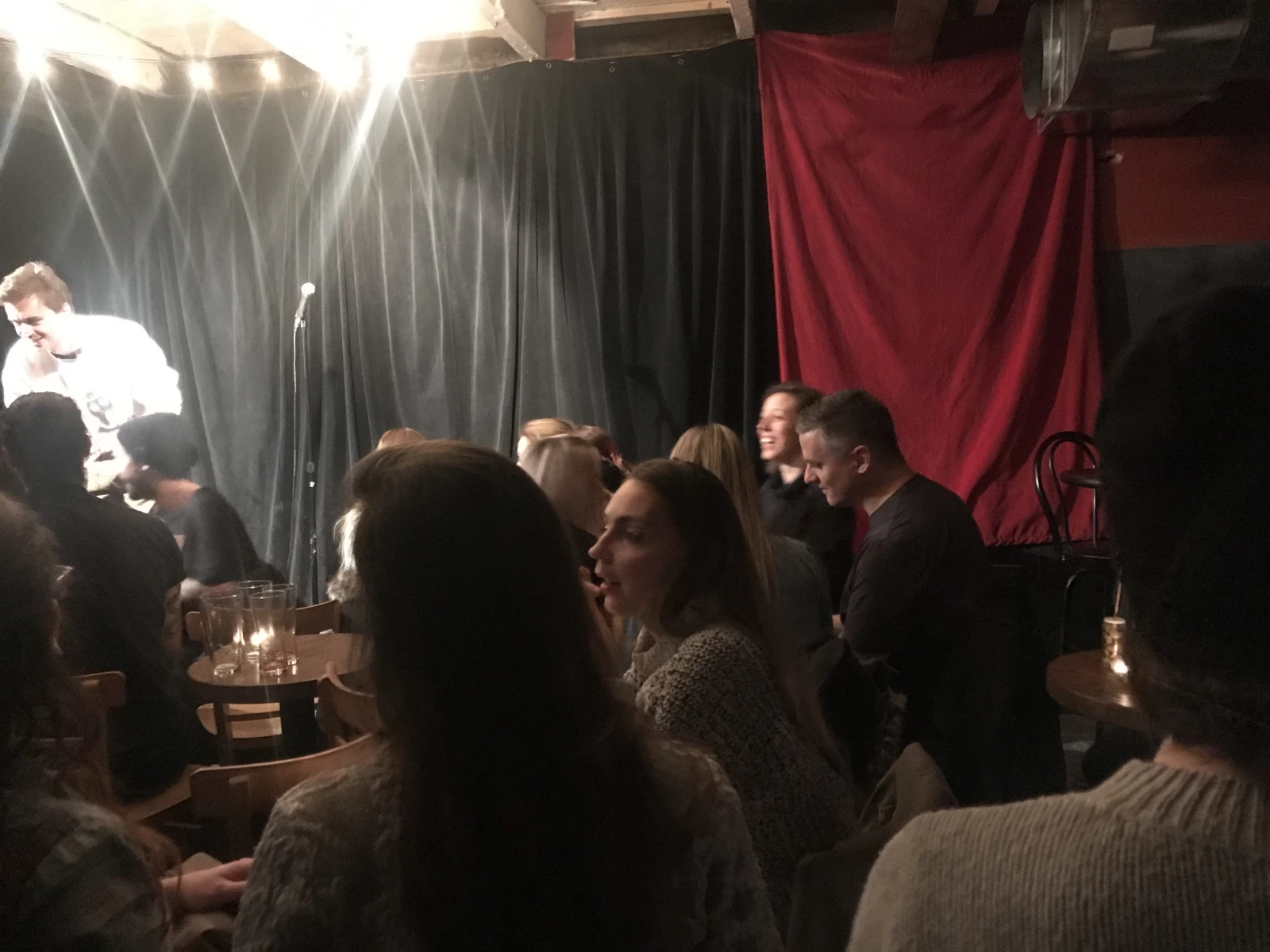 Un beau moitié-moitié d’habitués et de nouveaux, âgés entre 18 et 35 ans, constituait l’écosystème de la soirée. « Les humoristes aiment jouer au Terminal, c’est une place assez exceptionnelle pour roder son stock », me raconte l’agente d’artistes Sophi Carrier, aussi co-fondatrice du soon to be Comédie Club.
