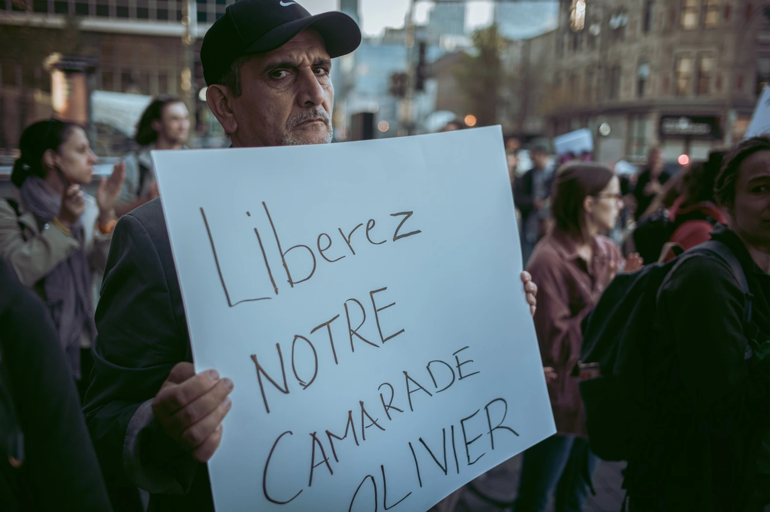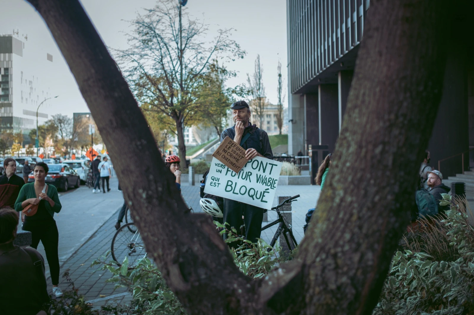 L’atmosphère, presque festive, contraste avec le motif du rassemblement : un soutien à Olivier Huard, dernier militant toujours incarcéré après l’occupation de six heures du pont Jacques-Cartier, le 22 octobre dernier. Neuf jours en détention précaire, dont cinq passés en grève de la faim.