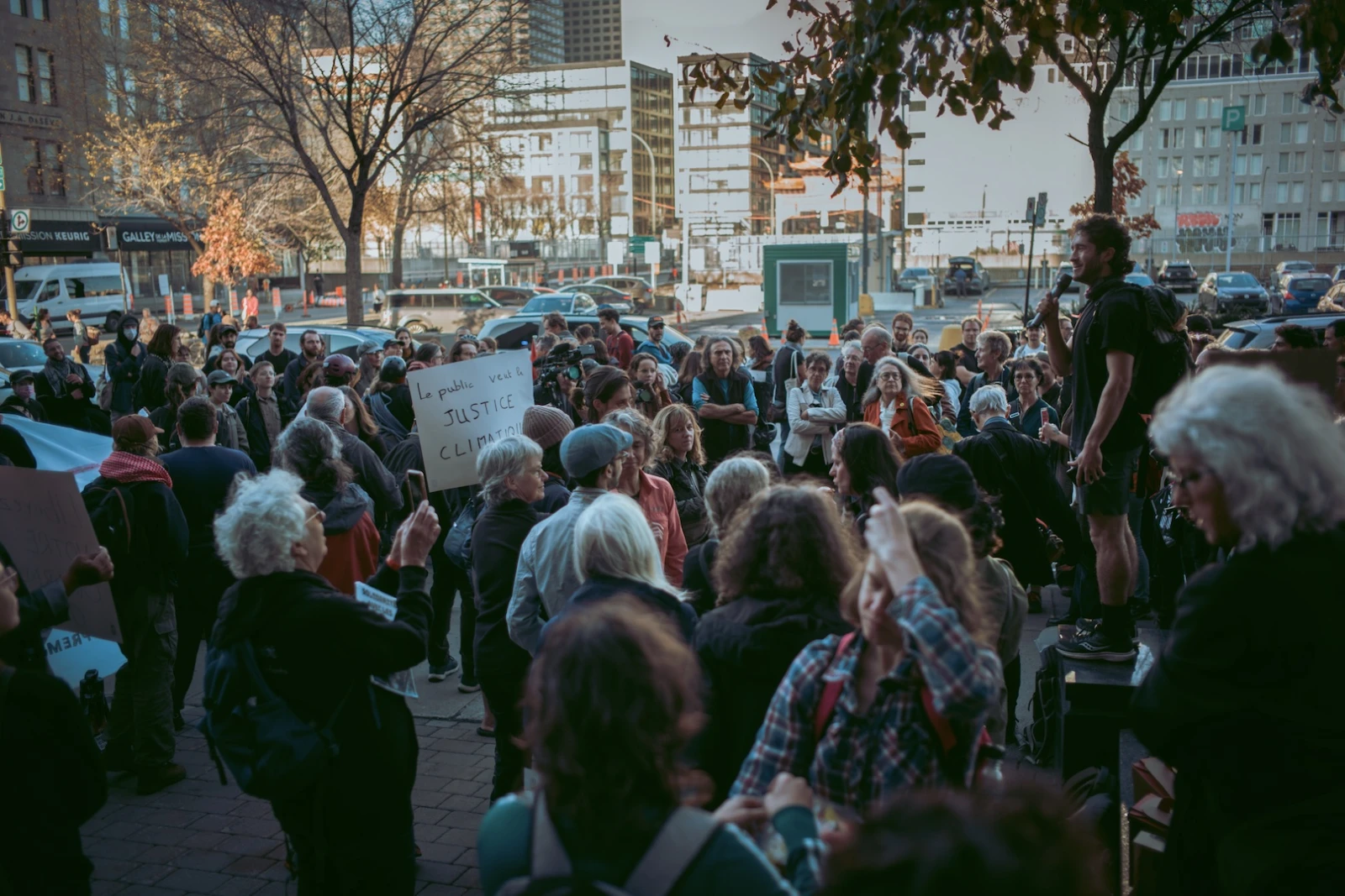 Sous un ciel d’Halloween étonnamment caniculaire, la Chorale du peuple élève sa voix devant le palais de justice de Montréal. Derrière eux, un cordon de policiers est traversé par des avocats en toge. Malgré la gravité de la situation, une étrange légèreté flotte dans l’air.