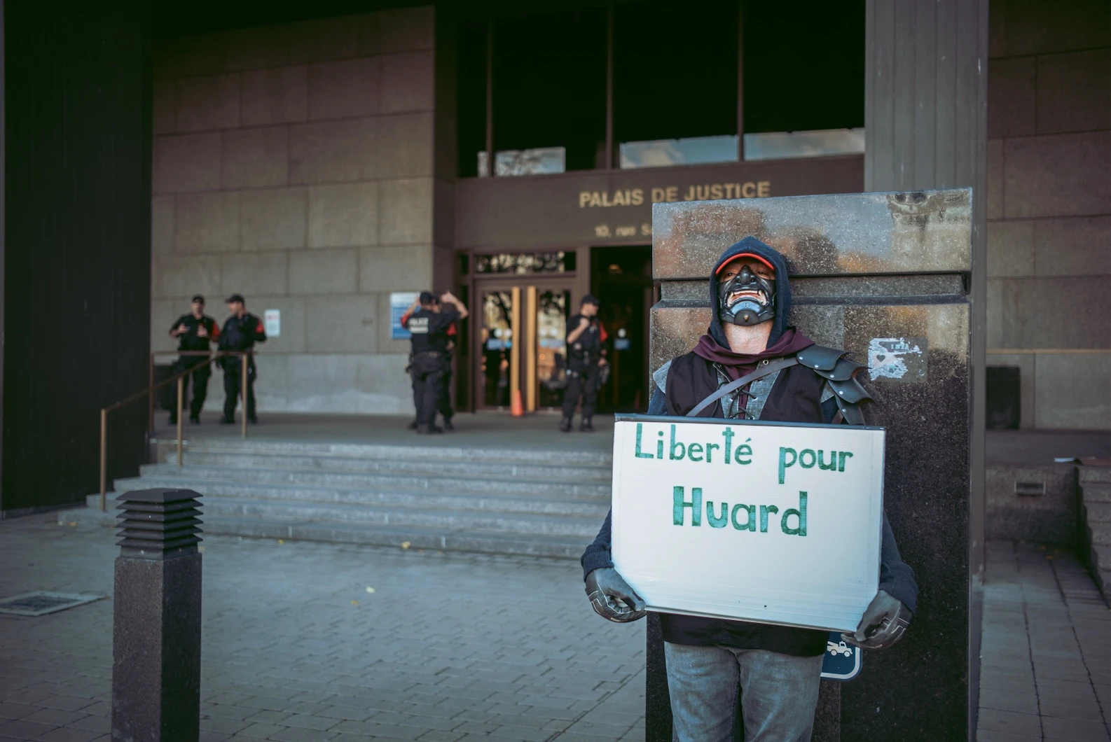 À l’intérieur du palais de justice, la salle d’audience où comparaît Olivier Huard est bondée, forçant l’ouverture d’une salle de débordement. Dans les couloirs, des militants s’installent à même le sol, attendant patiemment que la couronne présente ses preuves. L’atmosphère formelle est par moments brisée par des rires étouffés. La preuve, composée de photos Instagram et de vox pop capturés par TVA, provoque toutefois plus que des soupirs, forçant le constable à intervenir : « Le juge vous entend. La prochaine fois, je devrai expulser des gens de la salle. »