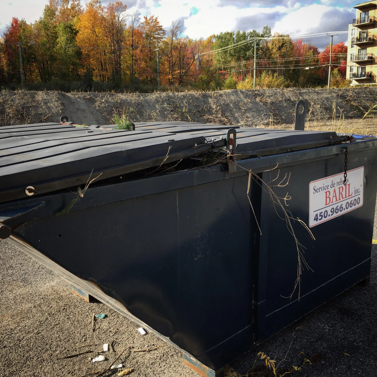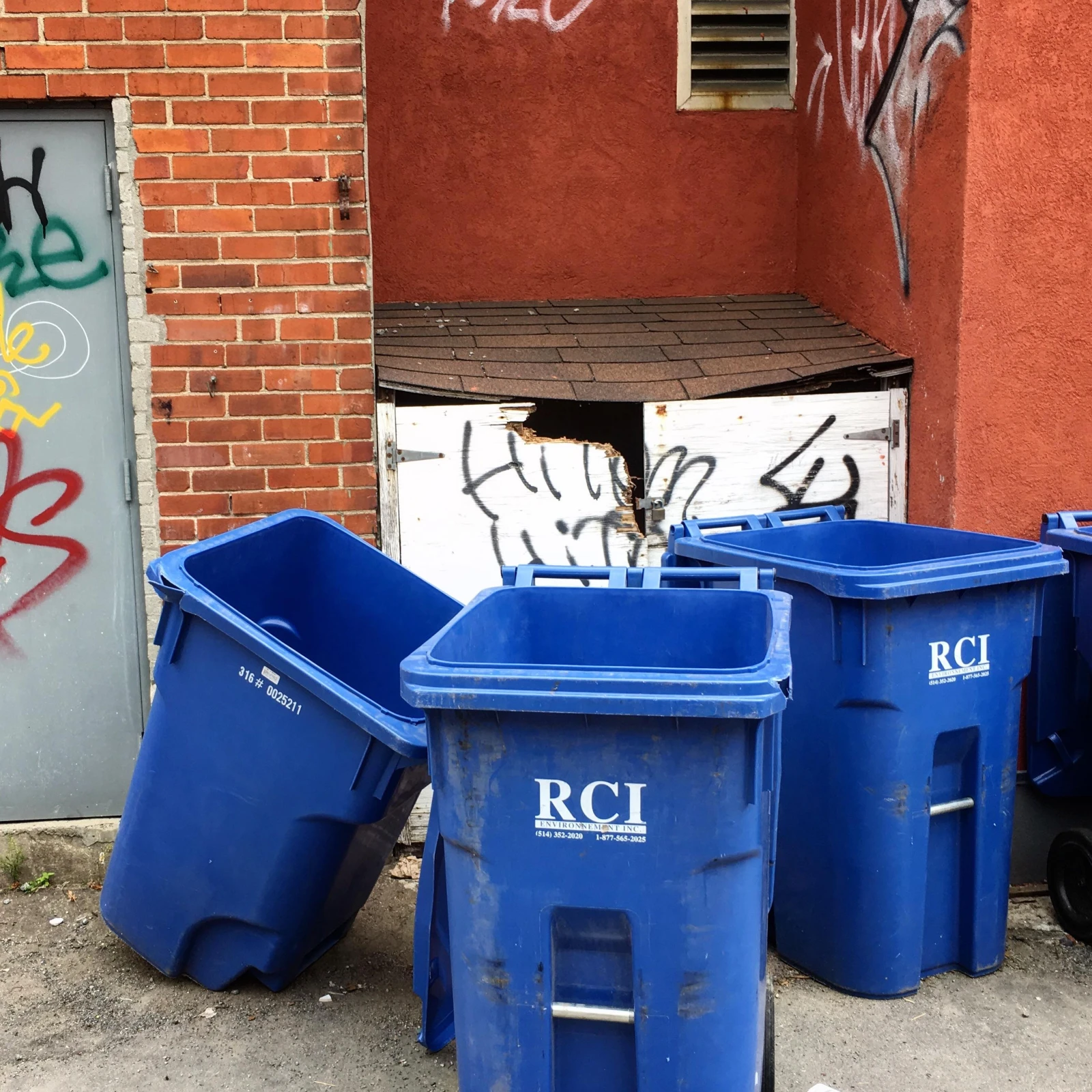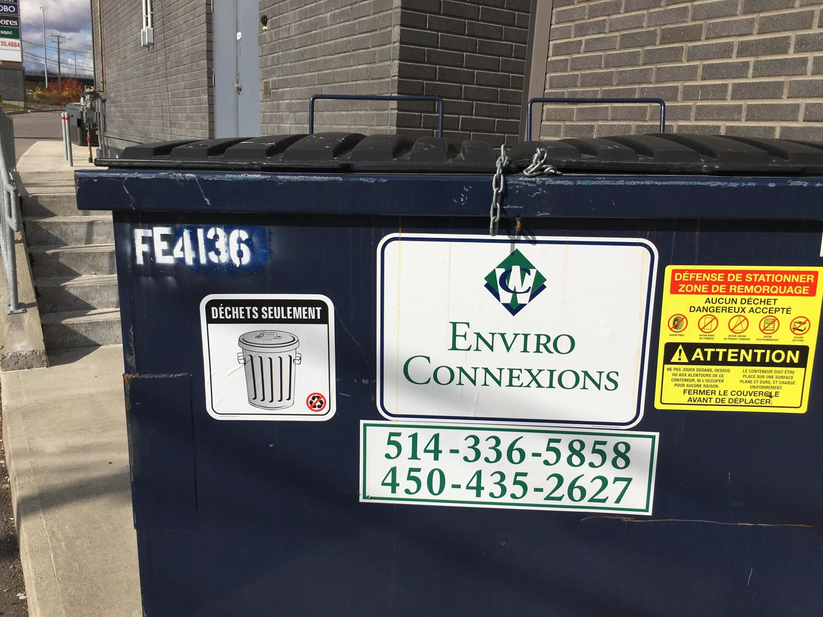 Premier arrêt : Mirabel, où le local de la société d’État voisine une pizzéria 2 pour 1. À notre passage, tout est en ordre dans le conteneur à l’arrière. La benne à ordures ne contient que des ordures et celle du recyclage était vide.