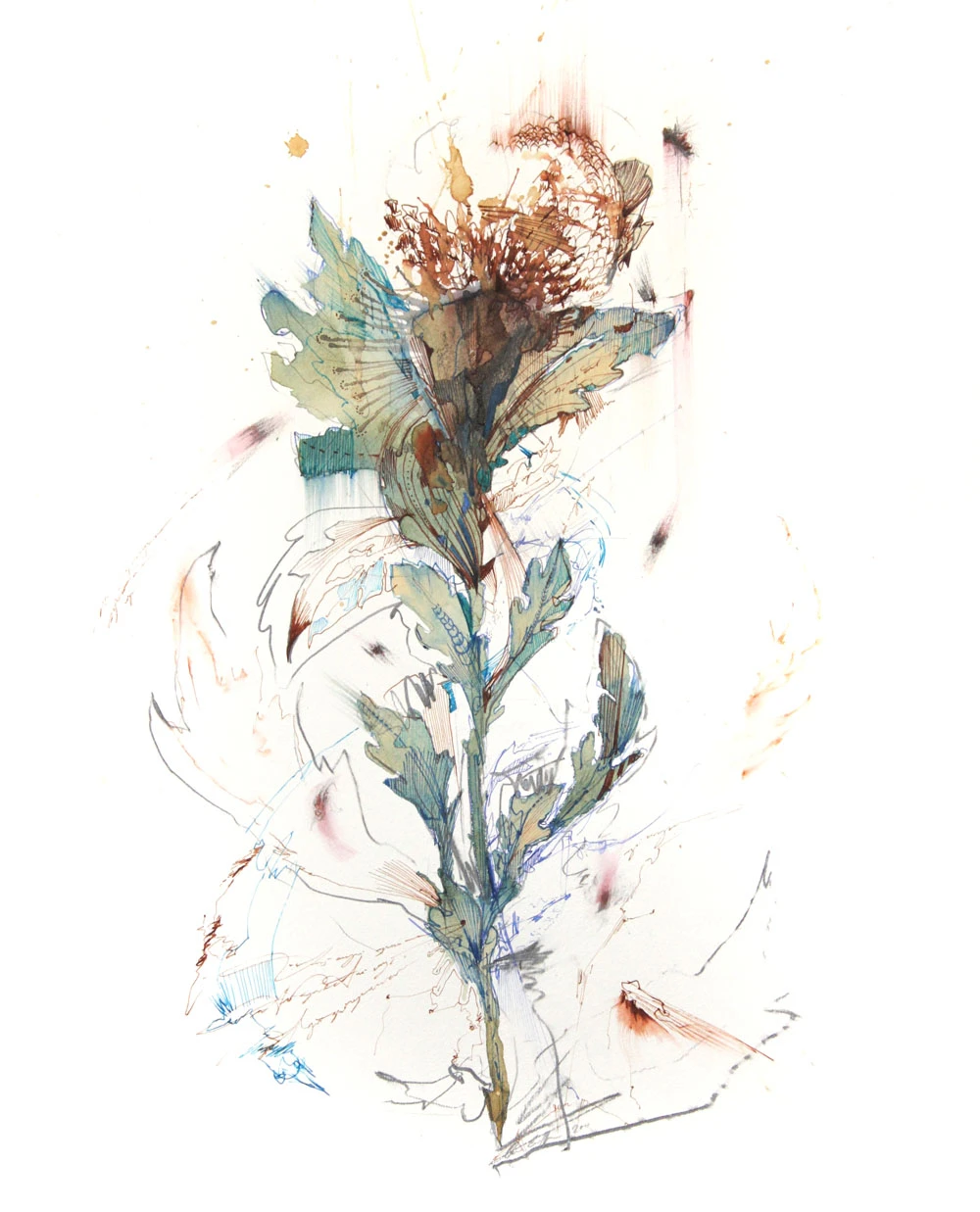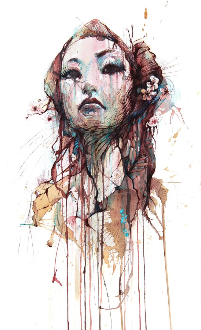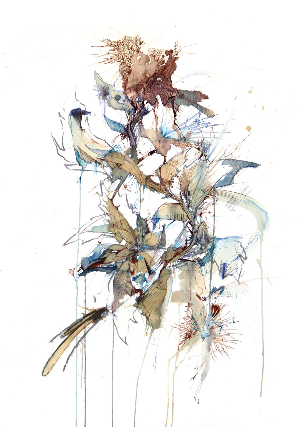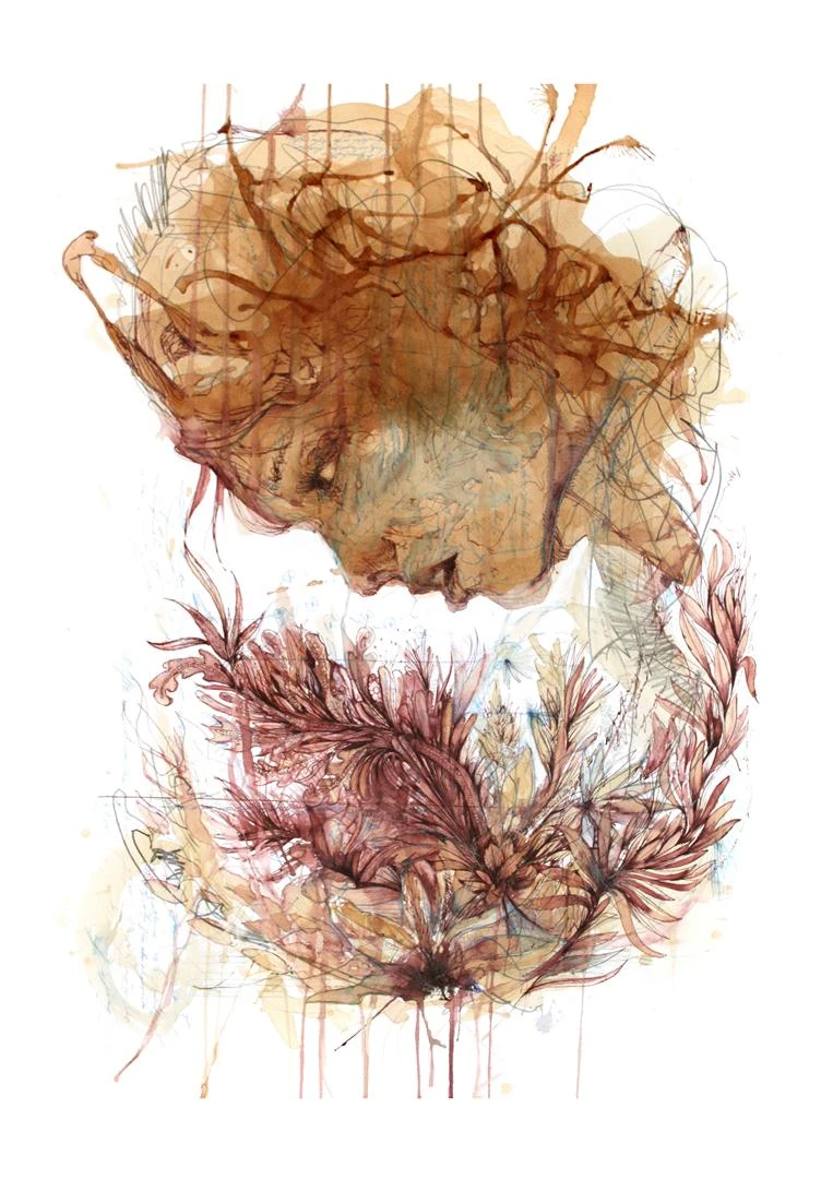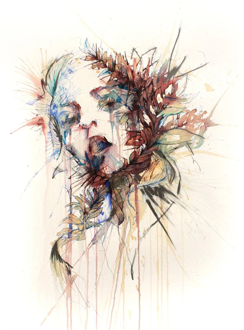 L’artiste anglais Carne Griffiths travaille principalement avec de l’encre de calligraphie et des liquides, comme le brandy, la vodka et le whisky. Fasciné par les «lignes invisibles», il crée des oeuvres qui explorent les formes humaines et florales. (www.carnegriffiths.com)