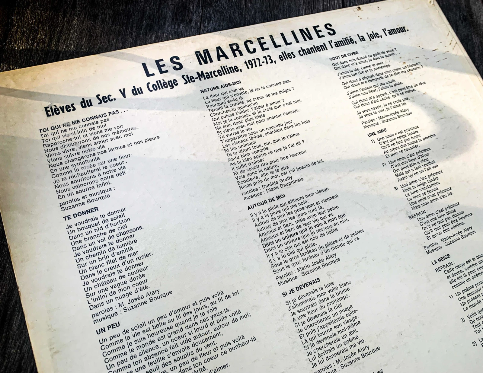 Septembre 2021. Je scanne chaque information disponible au dos de la pochette. L’année de parution indique 1972-73. La chorale est composée de 26 finissantes de secondaire 5 du Collège Sainte-Marcelline, une école privée située sur le boulevard Gouin dans le nord-ouest de l’île. Si les finissantes étaient alors âgées de 16 ans, elles auraient environ 64 ans aujourd’hui. Les textes et les mélodies sont en majorité signés par Marie-Josée Alary et Suzanne Bourque. Probablement les enseignantes religieuses ayant mené à terme le projet. Sur l’étiquette, aucun label n’est déchiffrable, fort à parier qu’il s’agit donc d’un pressage privé. Quelques indices, sans plus, mais jouables.