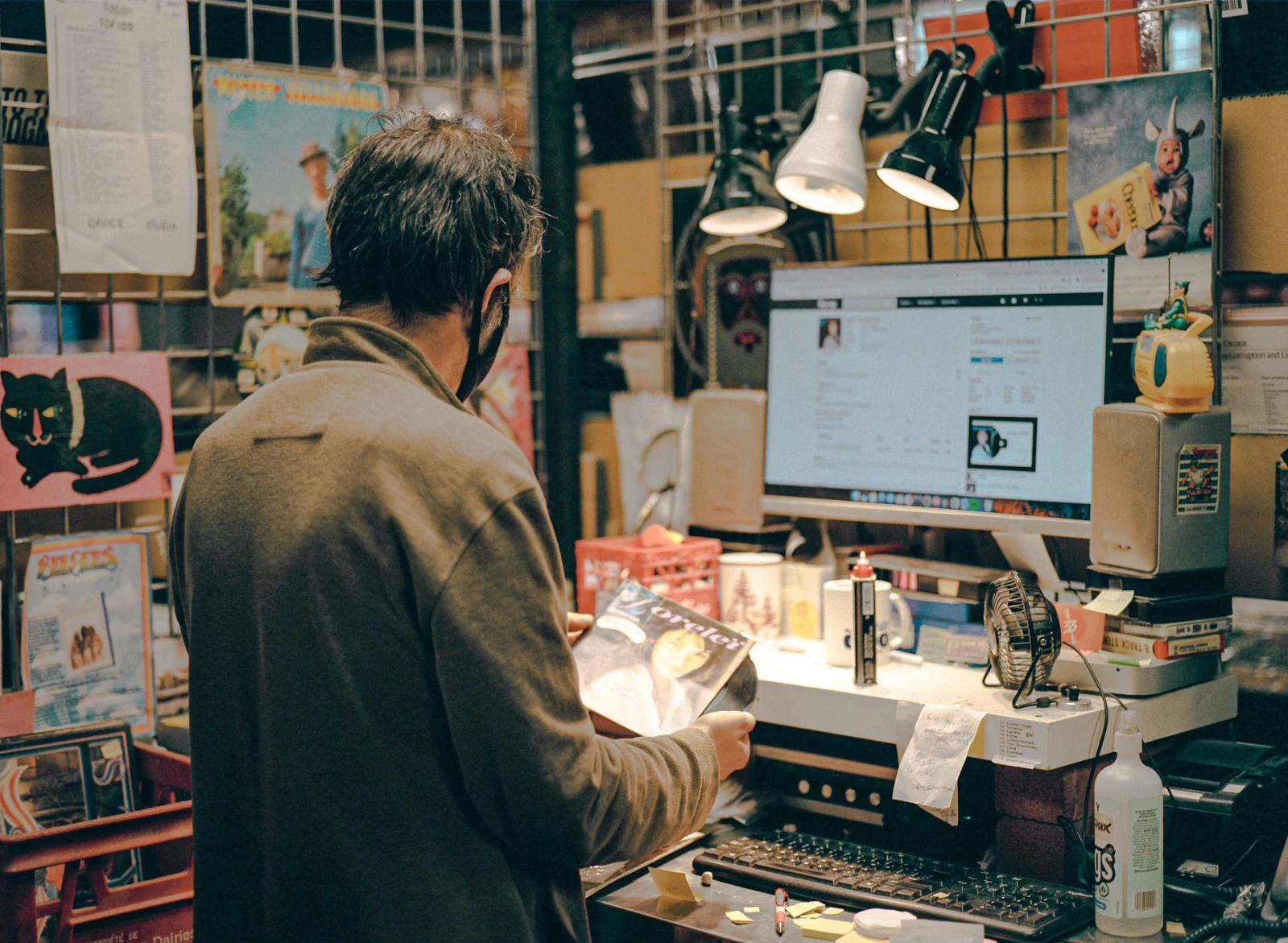 « Écoute ça, tu vas aimer, c’est sûr », me lance un collègue disquaire en sortant une pochette d’une vieille boîte oubliée au fond du sous-sol où nous travaillons. Il se lève en secouant la poussière sur ses genoux. À la lumière de mon cellulaire, nous scrutons le disque. Un album que je n’ai jamais vu. Dans un vol de chansons.