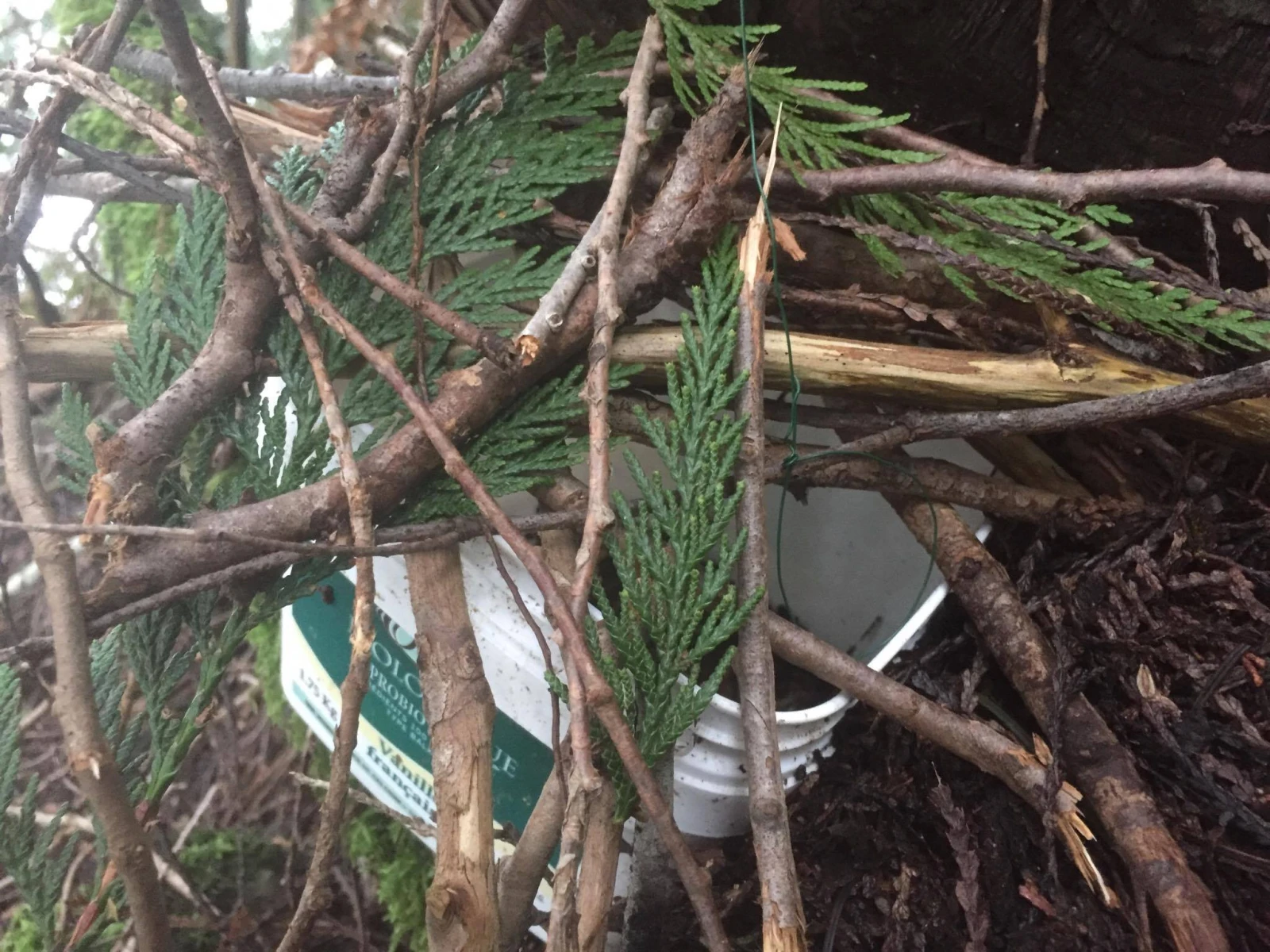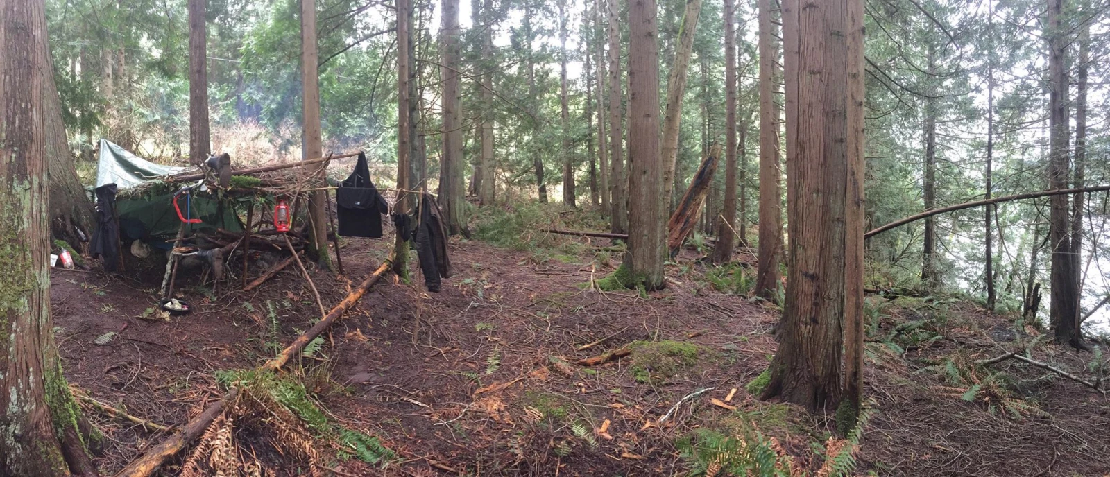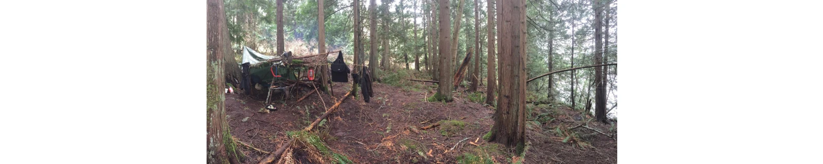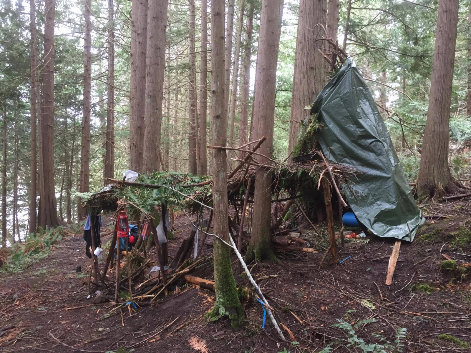 Arrivé sur place, le survivor en herbe ne perd pas de temps et se construit une cabane en 4h avec des branches et une toile (ça a l’air que c’est de la cabane de tuto Youtube). Qu’on s’entende sur la définition de cabane: quelques branches puis une toile posée par-dessus, rien à voir avec un beau tipi. Puis il ramasse du bois sec dans les alentours. Il est chanceux, la forêt de Salt Spring en offre en abondance.