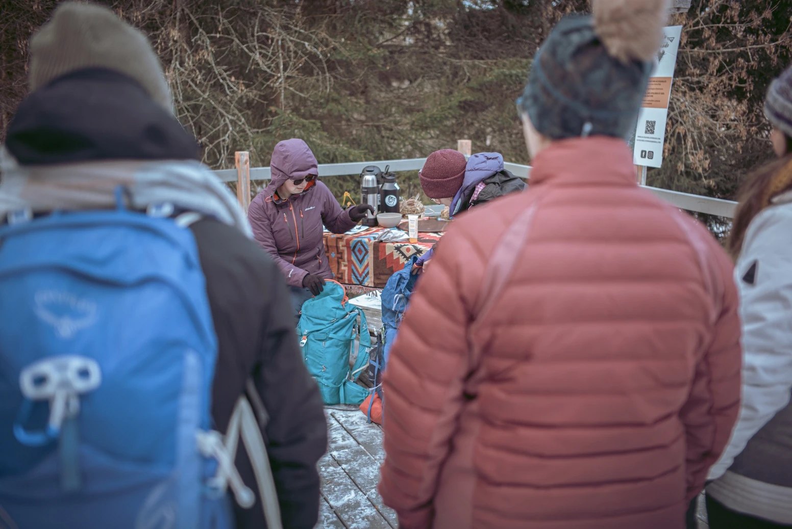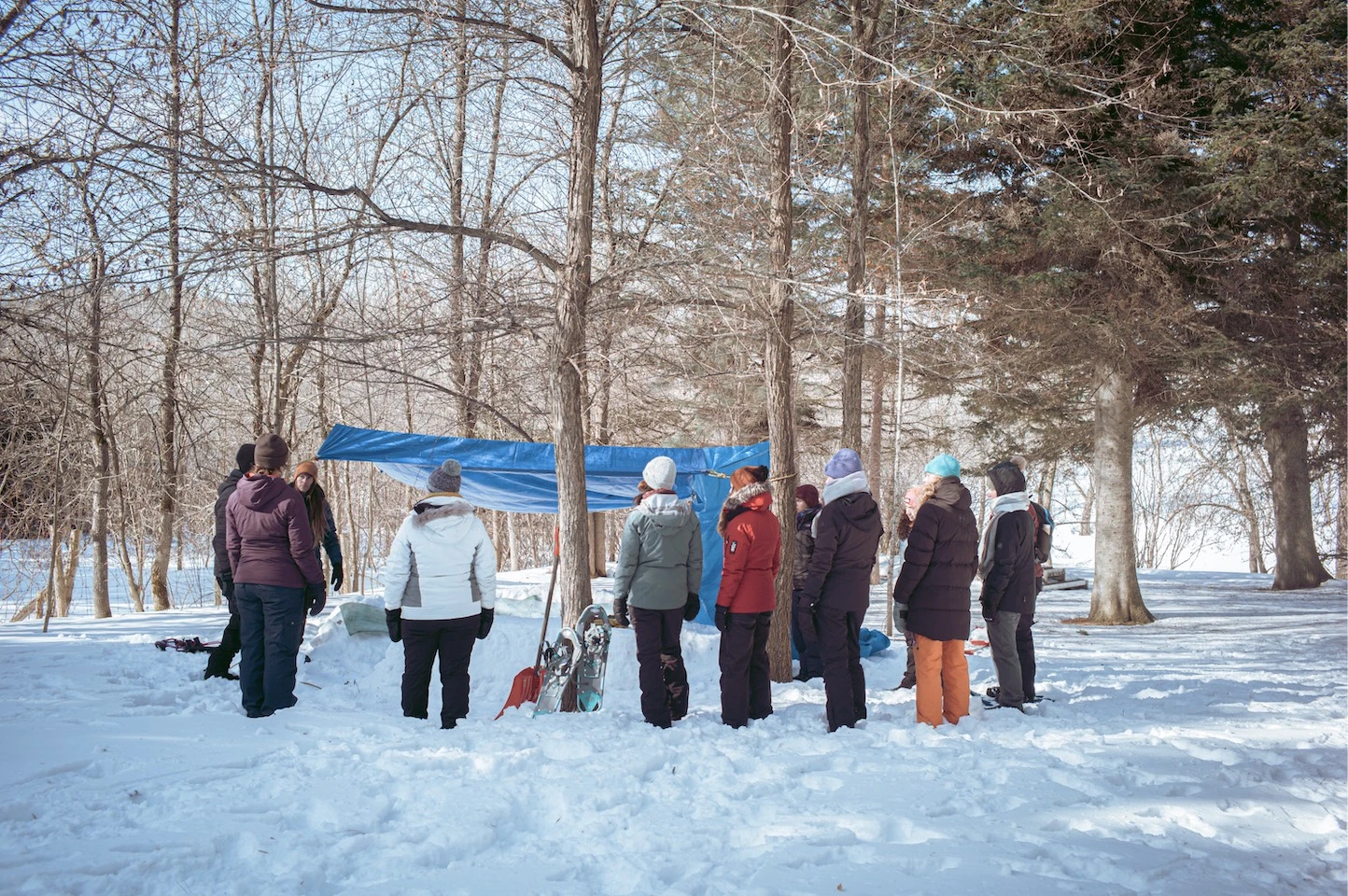 Neuf participantes attentives écoutent les instructions de la guide, venues s’initier à une journée d’apprentissage au trek hivernal. Des techniques essentielles, nourries par des ambitions au féminin.