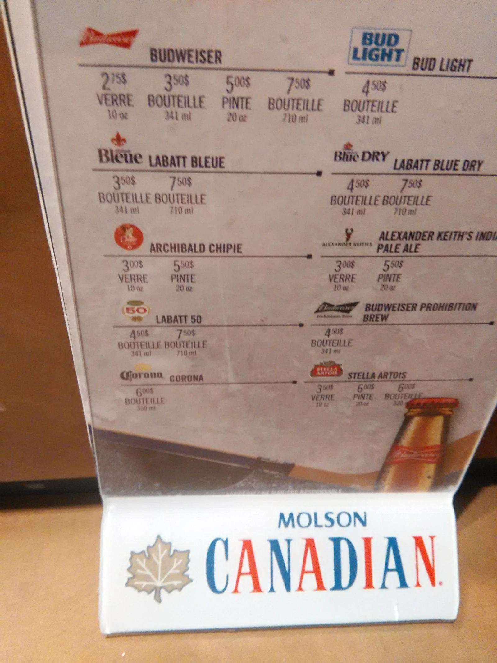 La lune de miel est de courte durée. Bien assis à siroter des gorgées de nos breuvages de prédilection, nous tombons nez à nez avec ce menu houblonné ridicule qui nous apprend la dure réalité : une Budweiser sans alcool en bouteille se vend une piasse plus cher que son pendant enivrant.