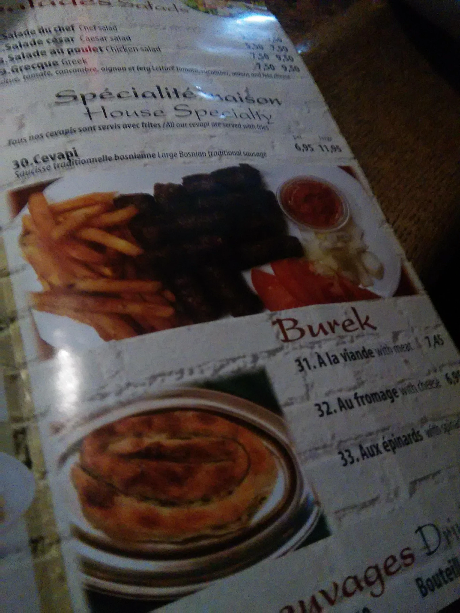 Quelques gorgées de O’Keefe plus tard, nous avons cette furieuse envie de manger autre chose que du sel. Ayant arrêté de servir des déjeuners depuis six heures, Le Gagnant ne propose aucune autre alternative bouffe à part des croustilles. Après avoir consulté quelques piliers de la place, nous prenons donc la décision de commander au Bosna Pizza, restaurant soi-disant yougoslave établi à Pierrefonds.