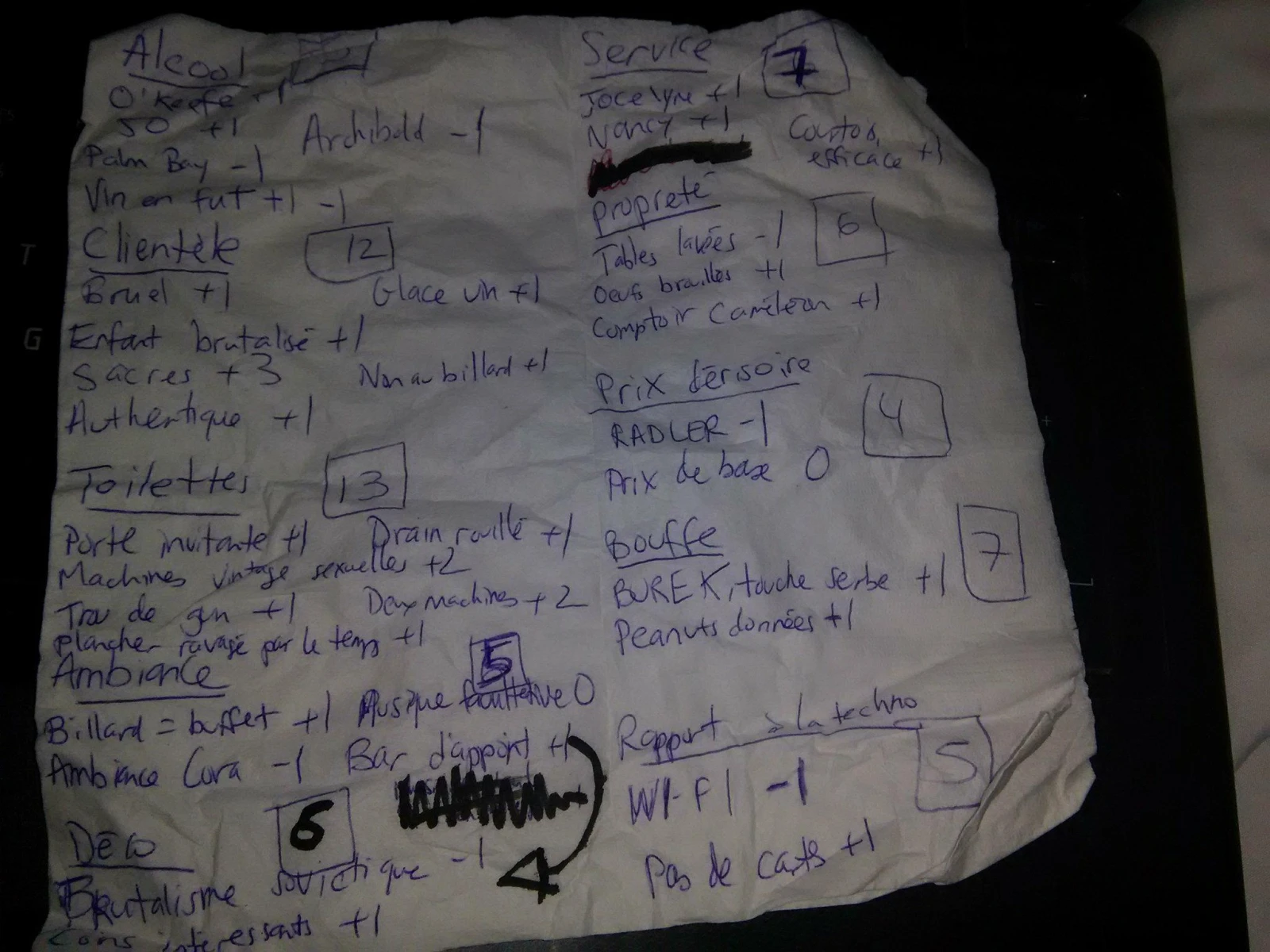 Logiquement ivres, nous prenons soin d’écrire sur une napkin le résultat de nos différentes observations. Pour chacun des 10 critères, la taverne bénéficie d’emblée d’un total de cinq points, auxquels sont ajoutés ou retirés des points en fonction des motifs précédemment évoqués.