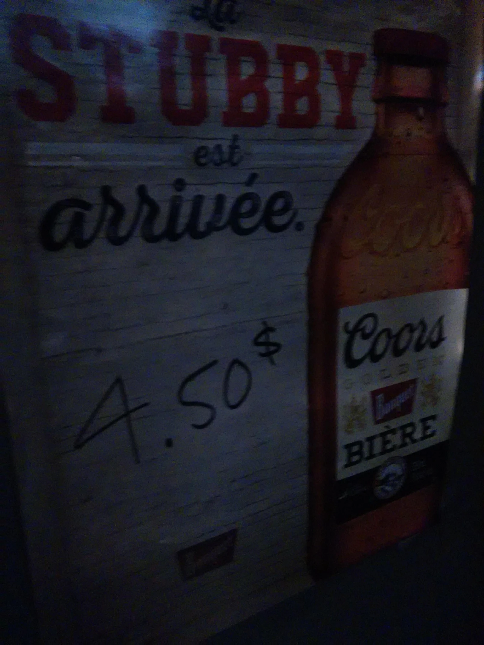 Un peu choqués que ce débit de boisson soit muni d’un accès wi-fi, nous acclamons son refus d’offrir à ses clients le paiement électronique, car selon nous, toute taverne doit s’opposer vivement au progrès, quel qu’il soit.